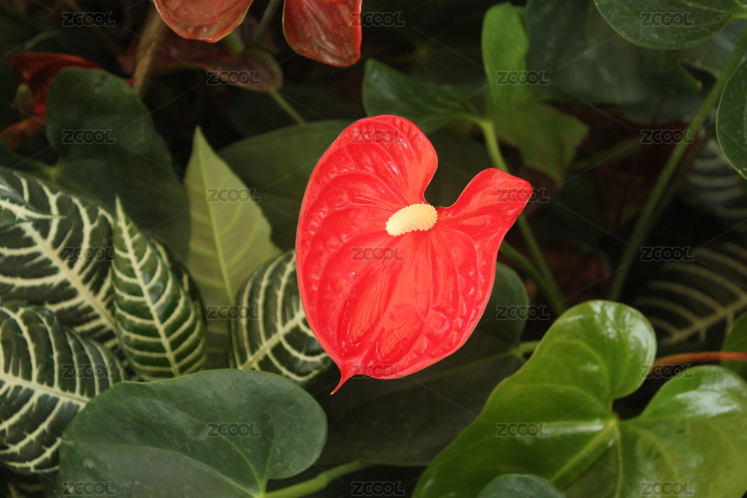 花叢中的一朵紅色的花燭花朵