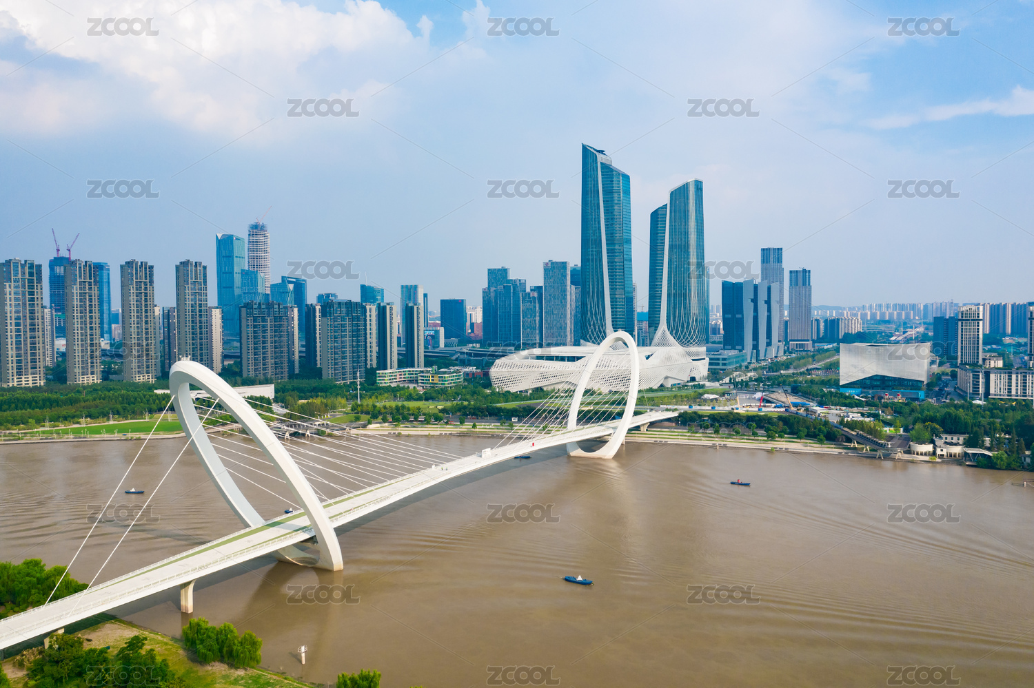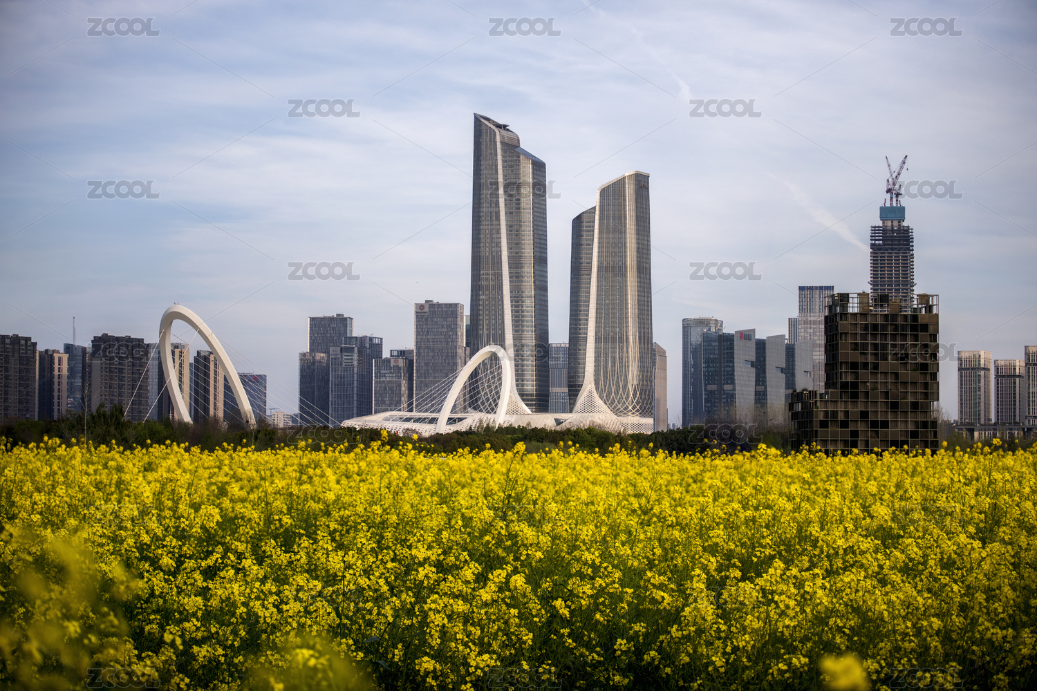 中國(guó)江蘇南京眼步行橋雙子塔城市天際線風(fēng)光