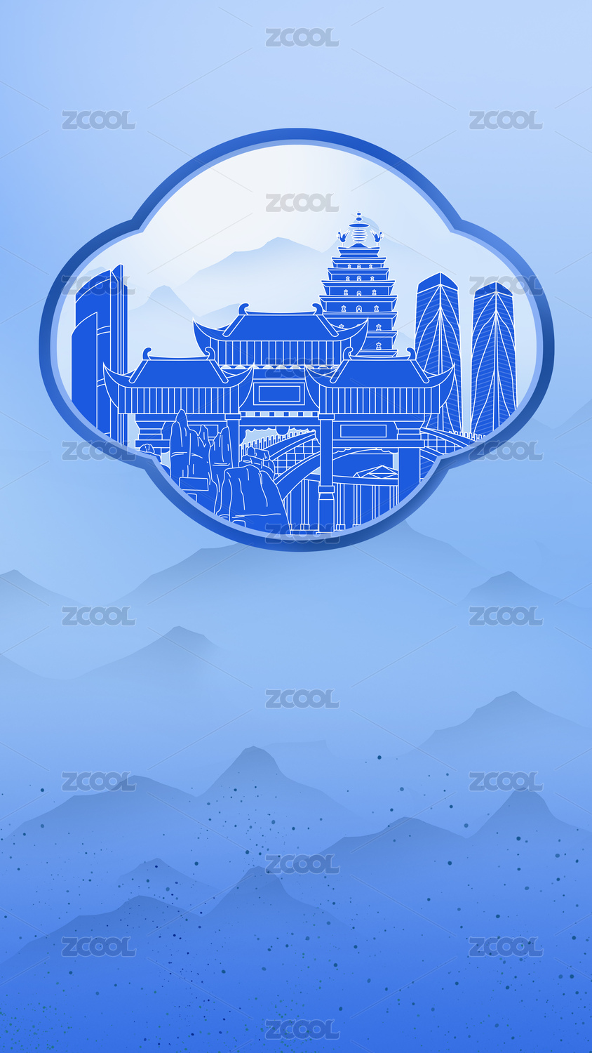 杭州藍(lán)色青花瓷古典山水畫淡雅山峰窗戶景觀