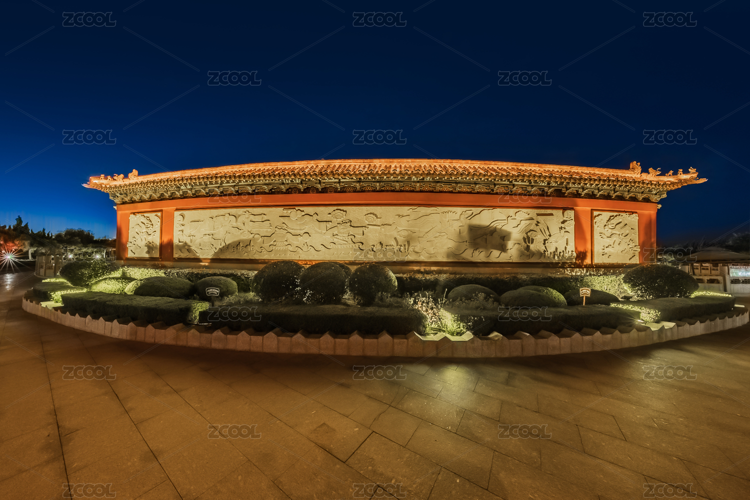 山東省蓬萊閣市夜晚燈光八仙壁浮雕裝飾建筑