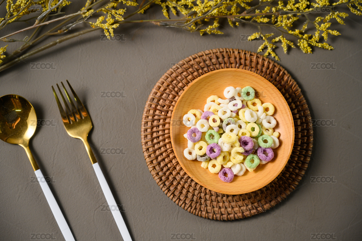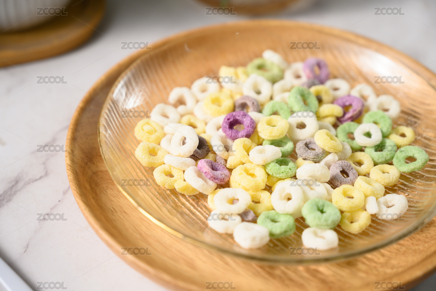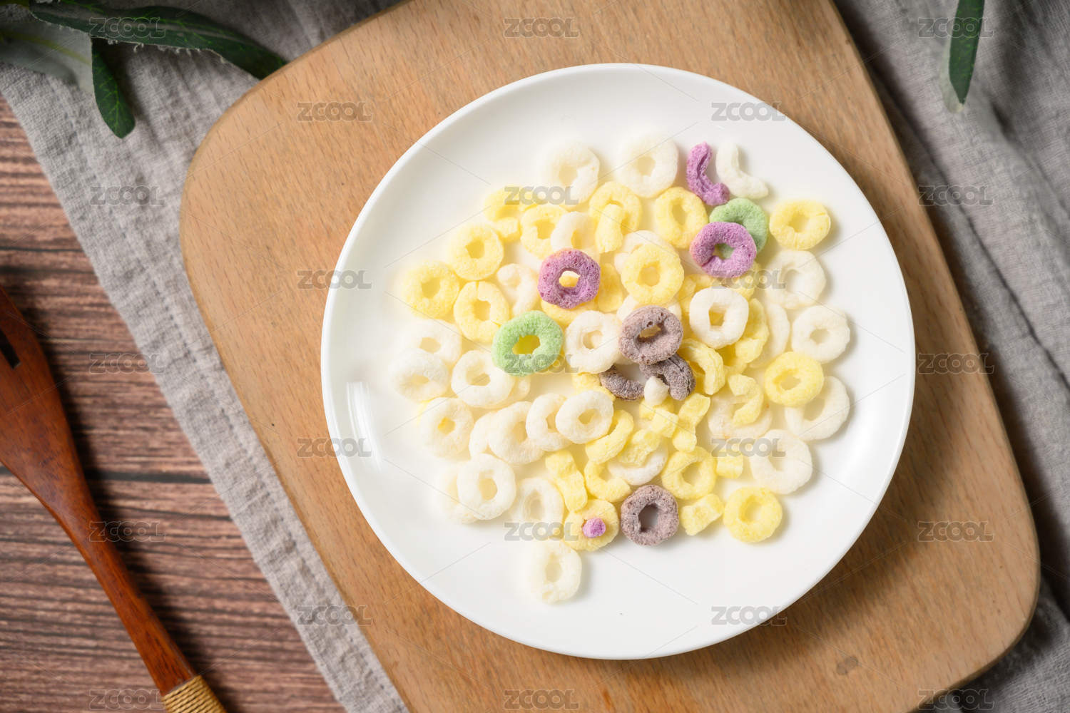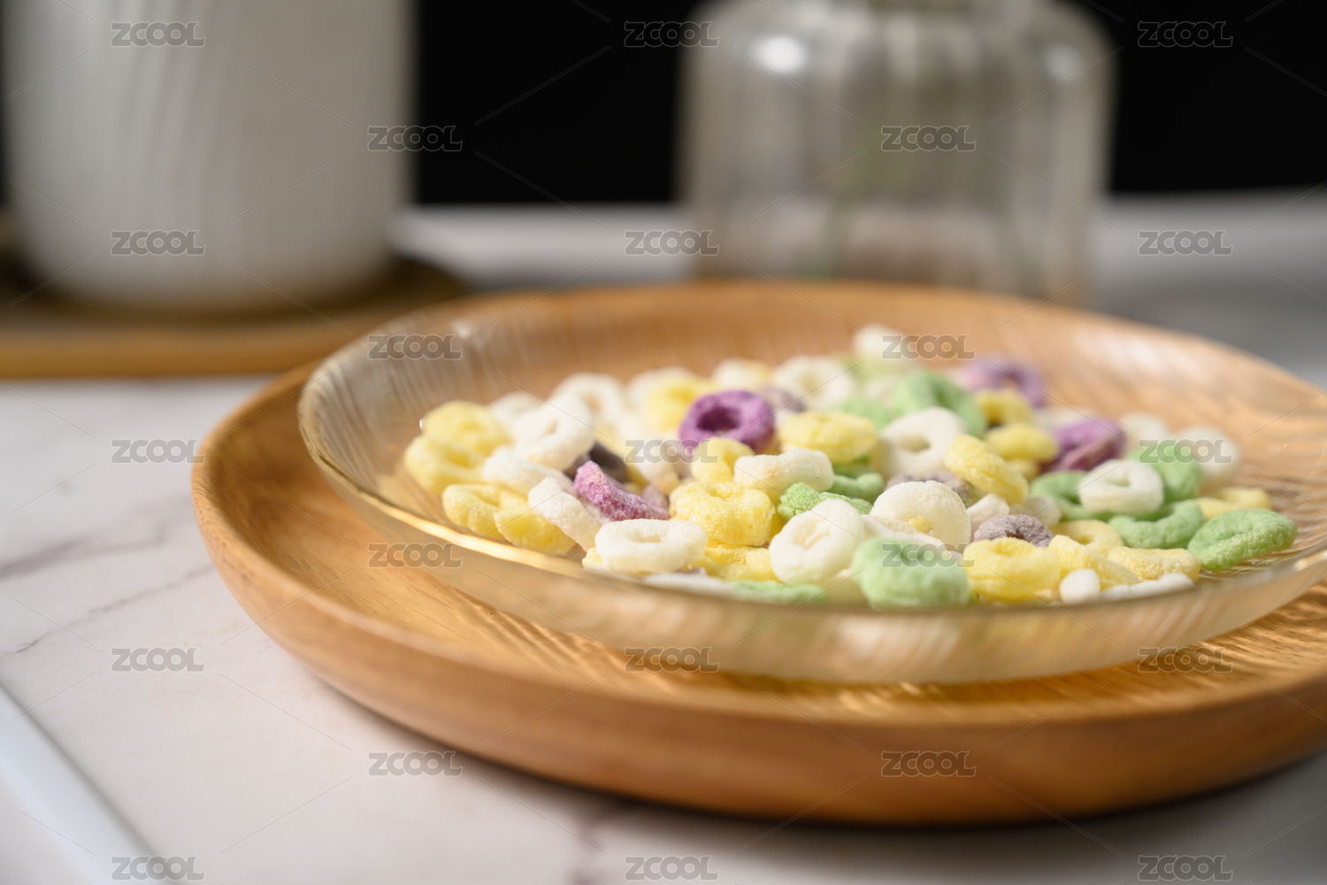 桌面上的盤(pán)子里的美味可口的谷物圈