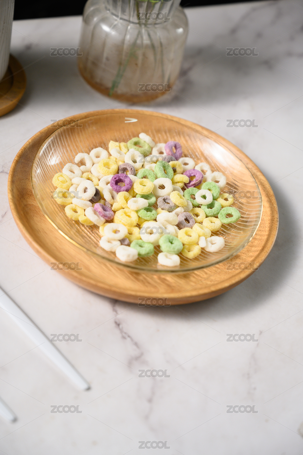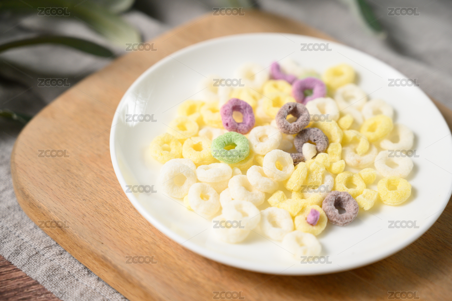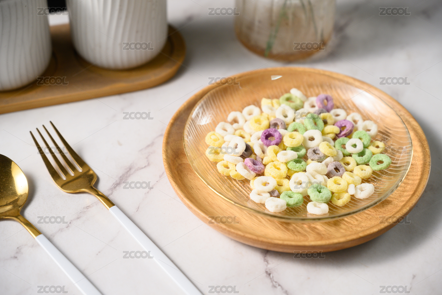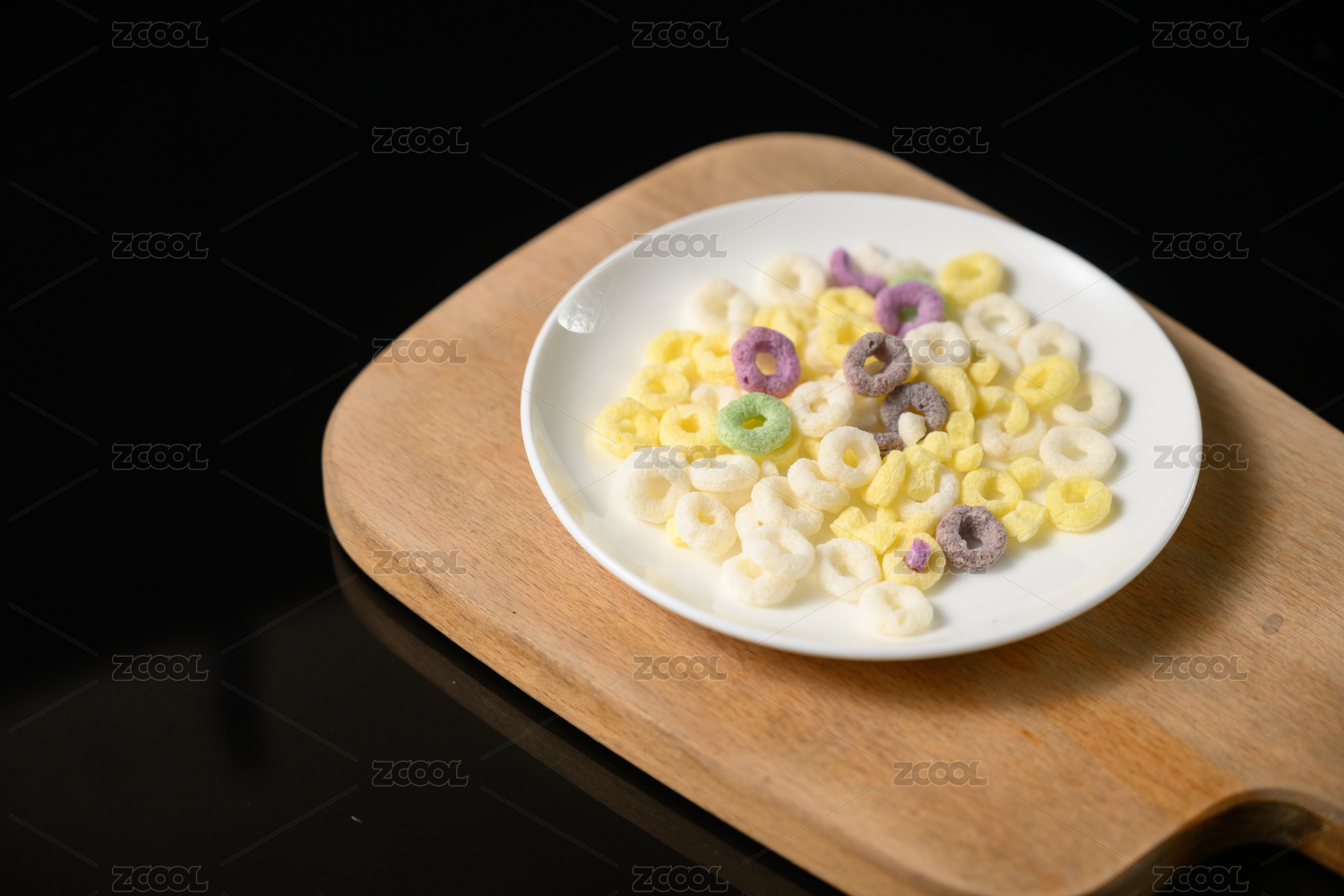 桌面上的盤(pán)子里的美味可口的谷物圈