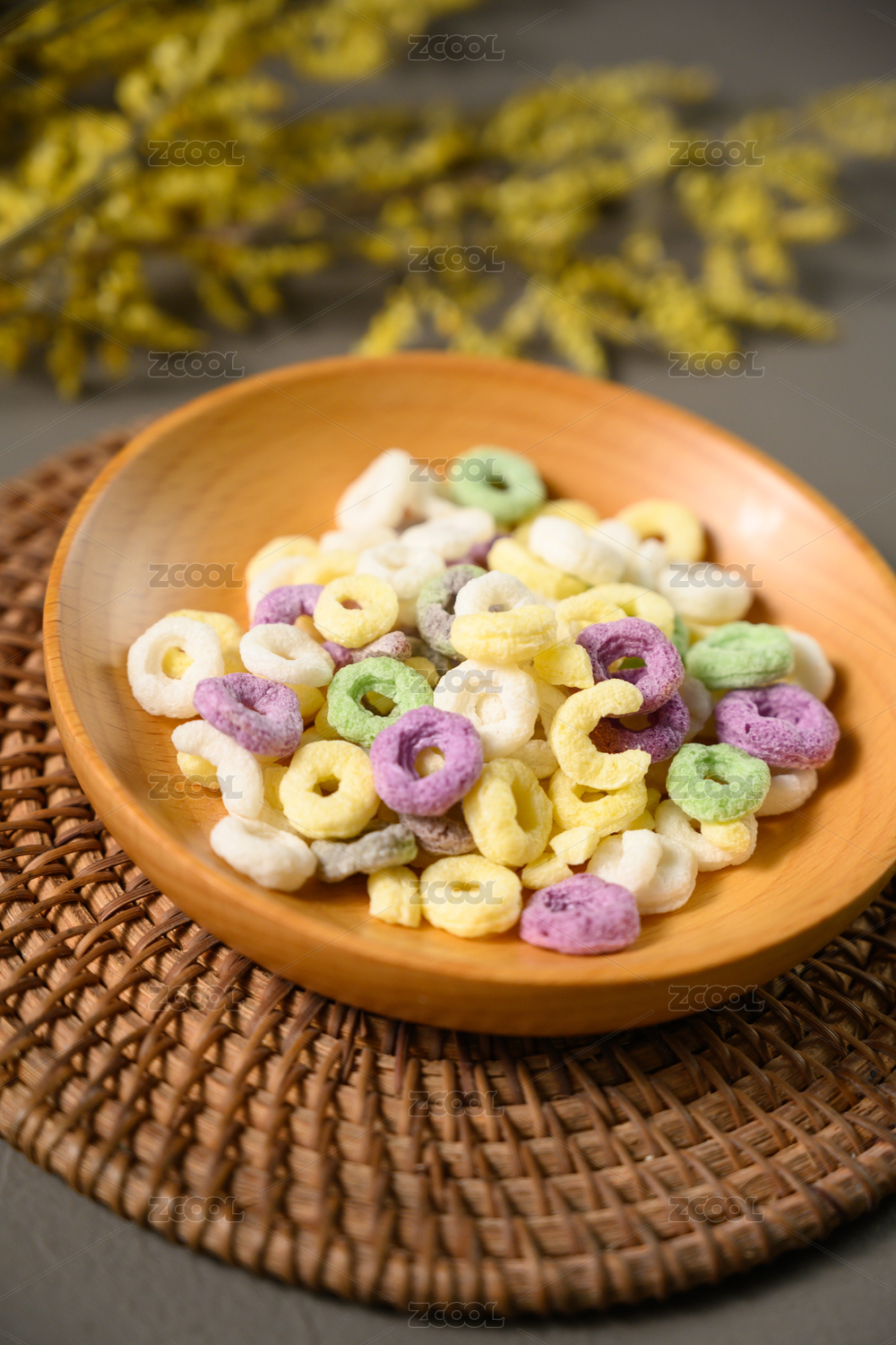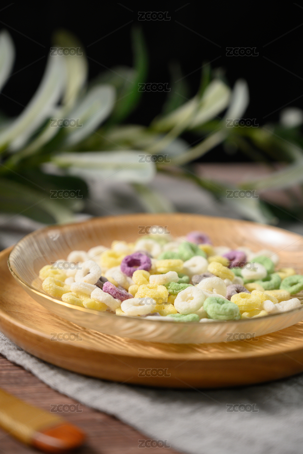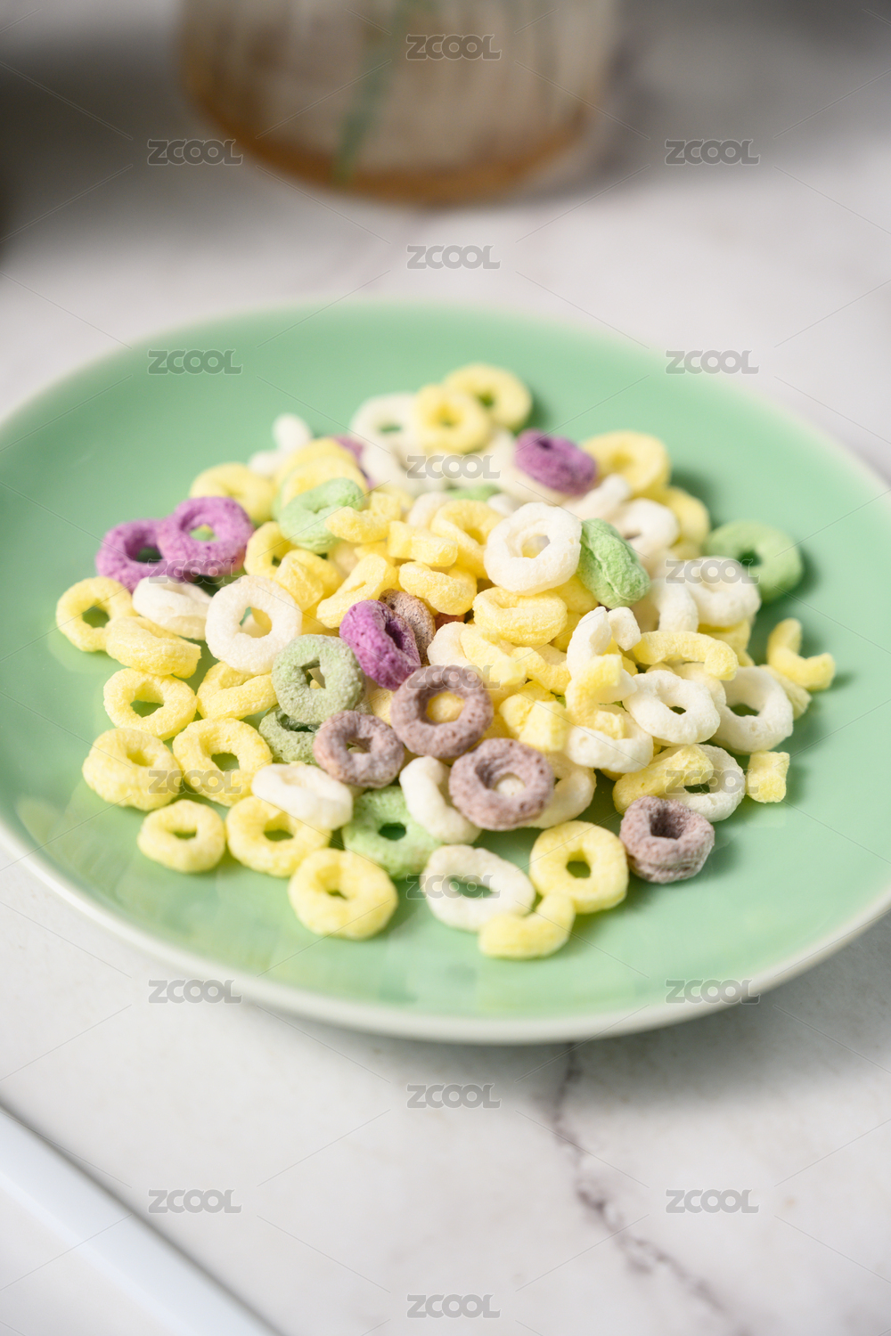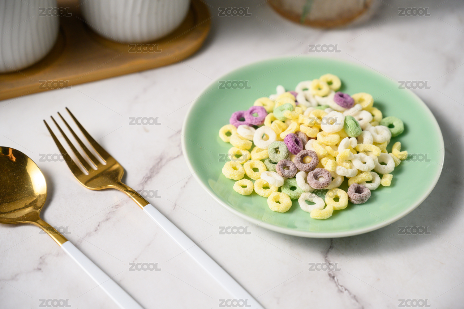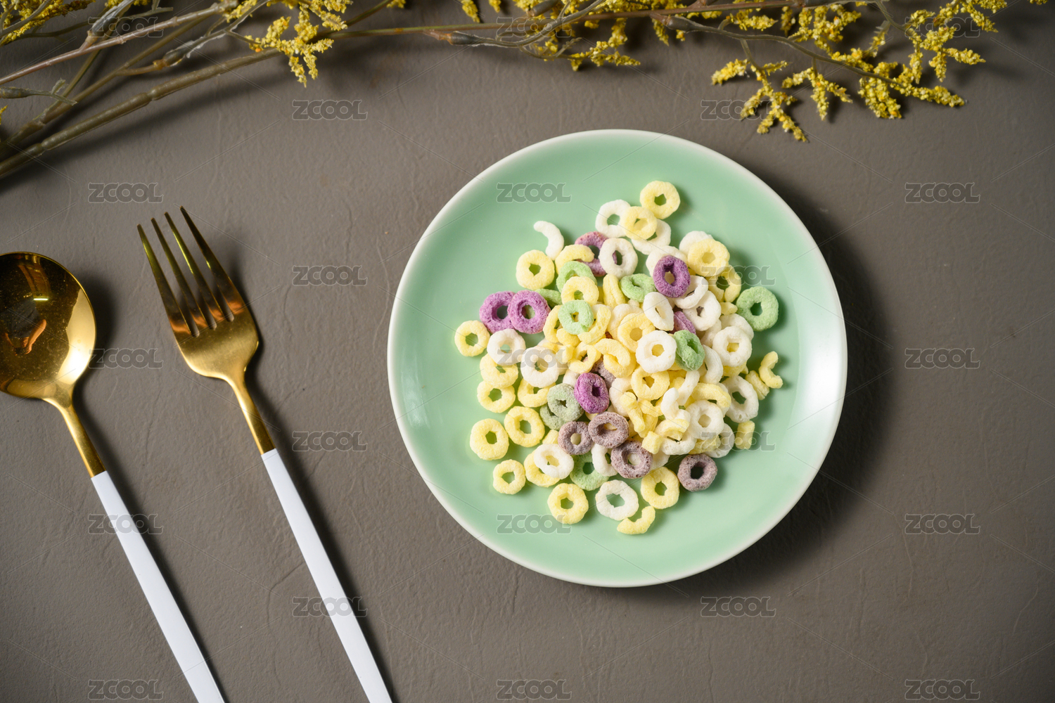 桌面上的盤(pán)子里的美味可口的谷物圈