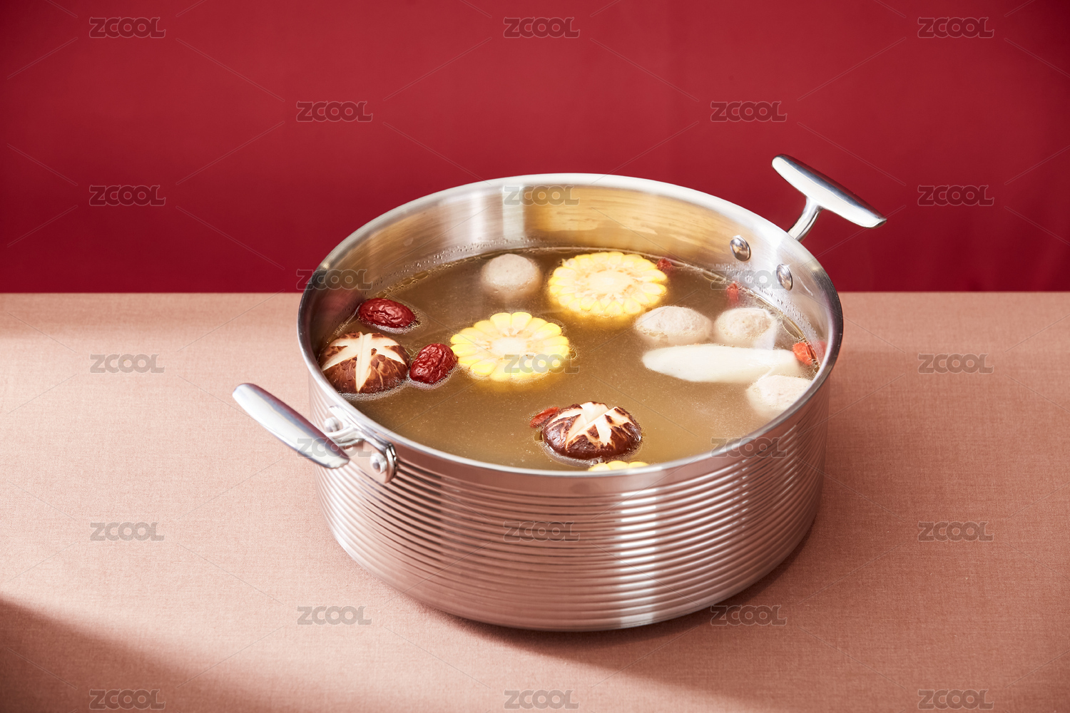 鮮美的菌菇火鍋鍋底擺放在不銹鋼臺面上