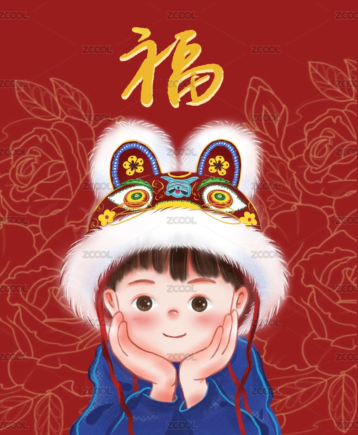 帶著帽子的小朋友福氣滿滿慶祝過(guò)年