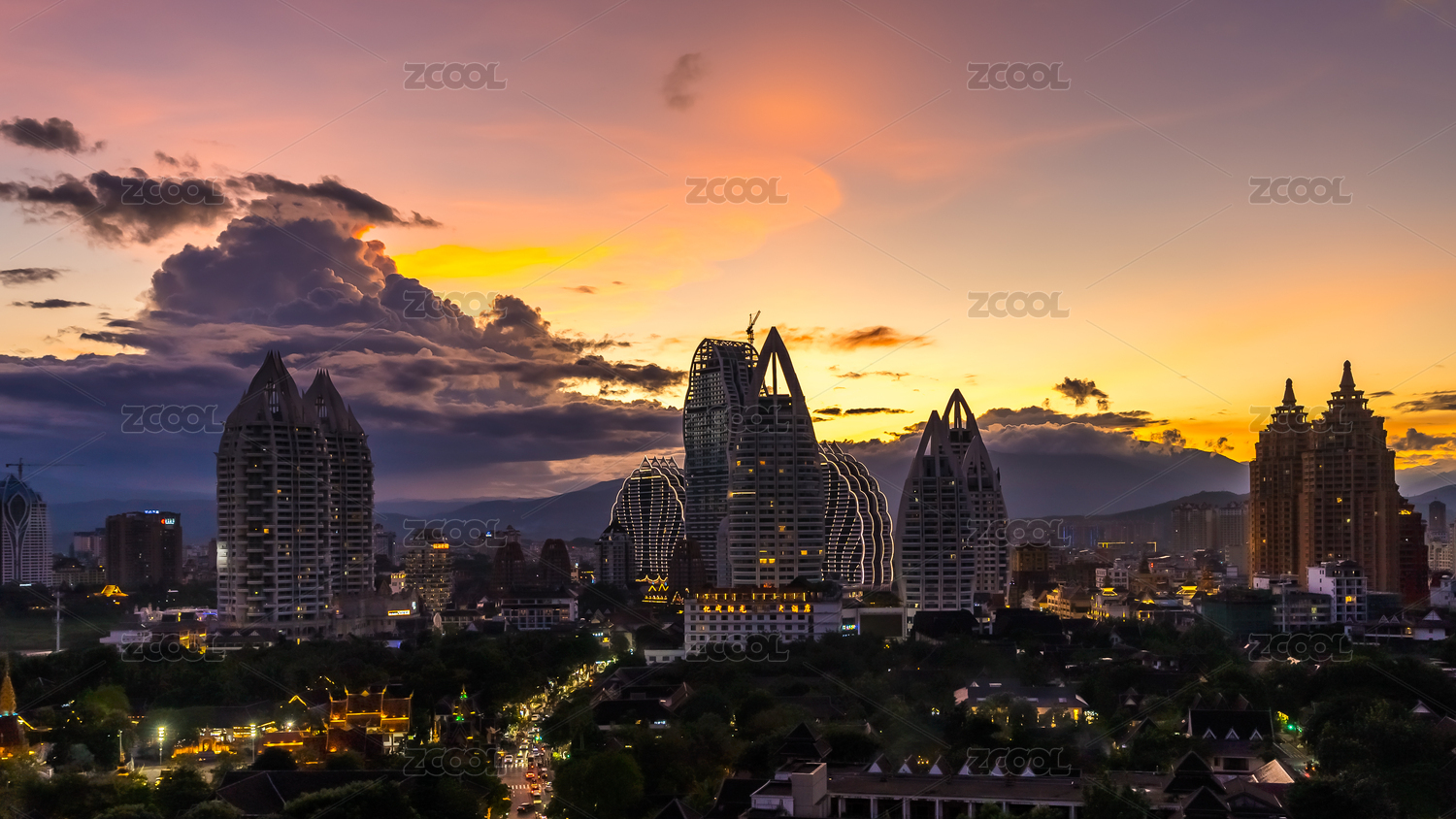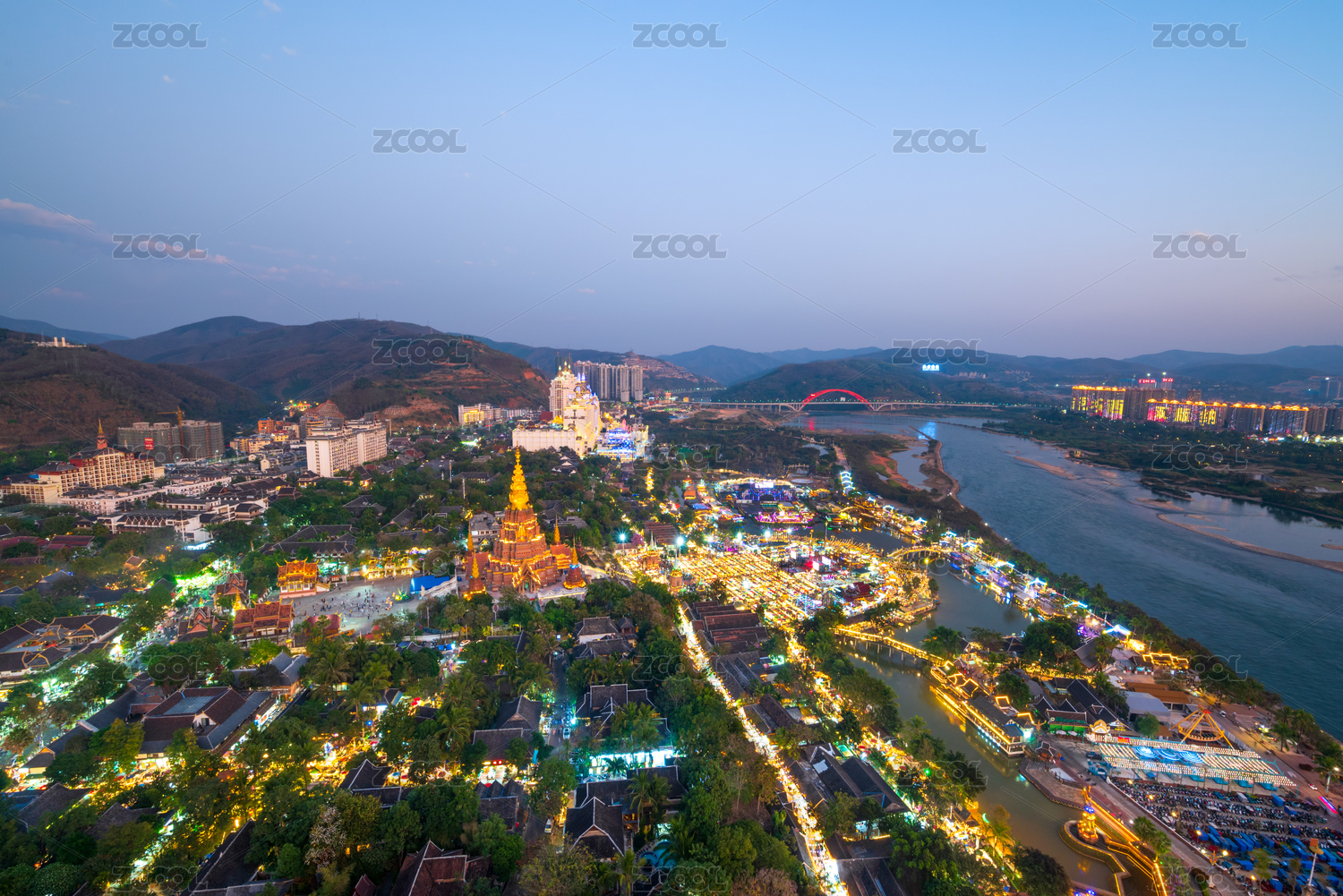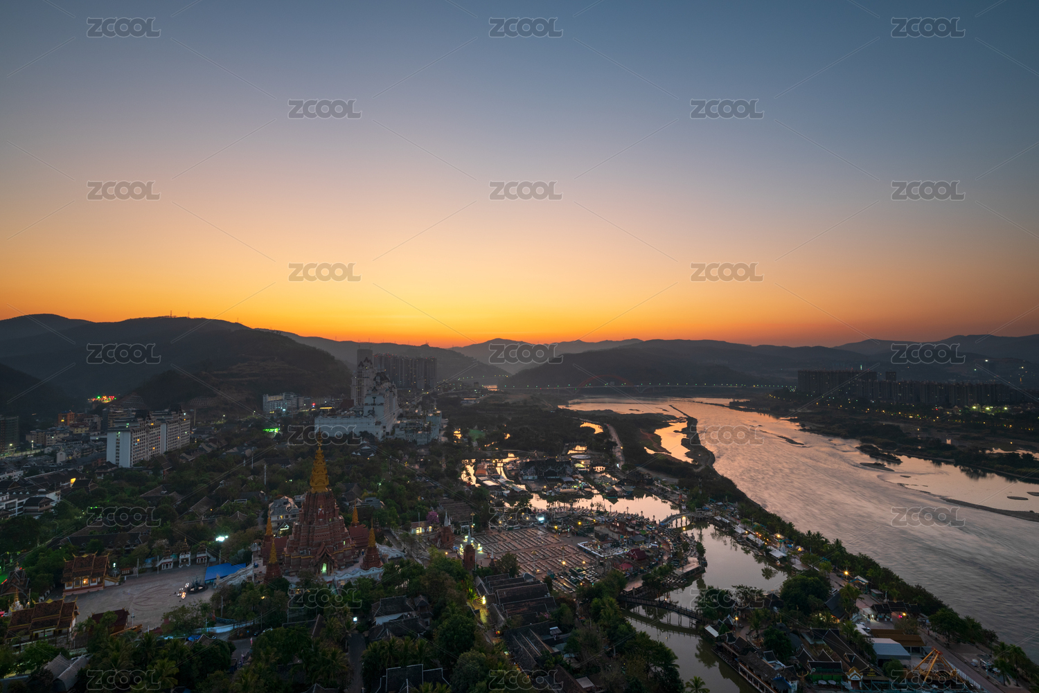 西雙版納景洪市告莊和湄公河星光夜市日出
