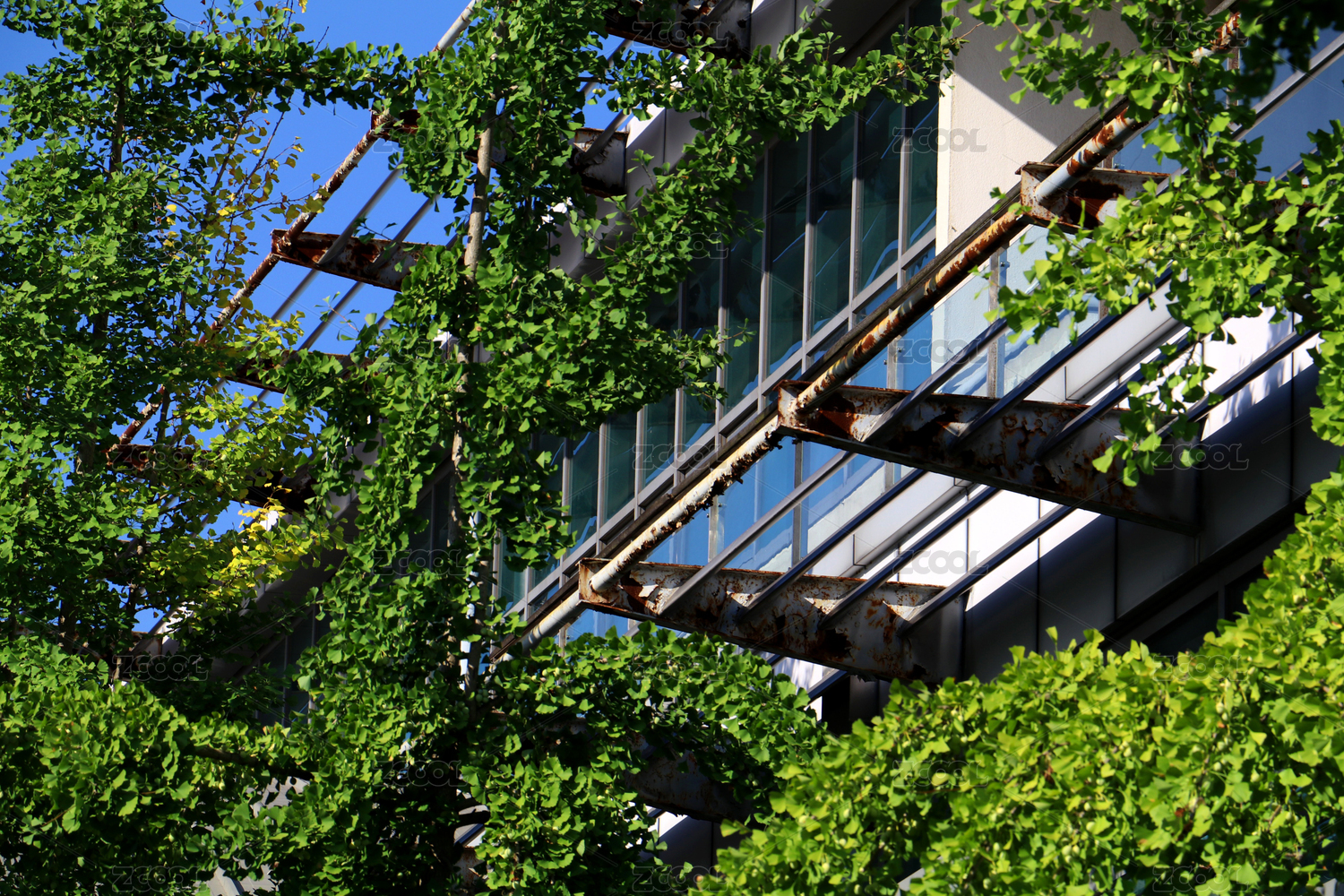 藍(lán)天下翠葉環(huán)抱的玻璃幕墻與金屬格柵