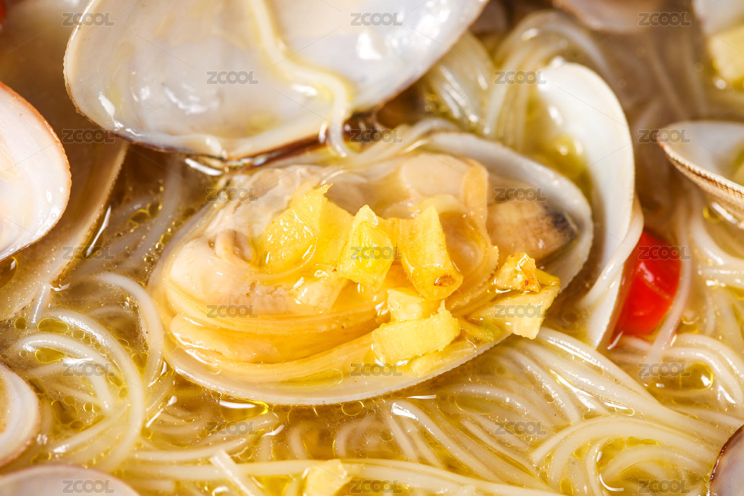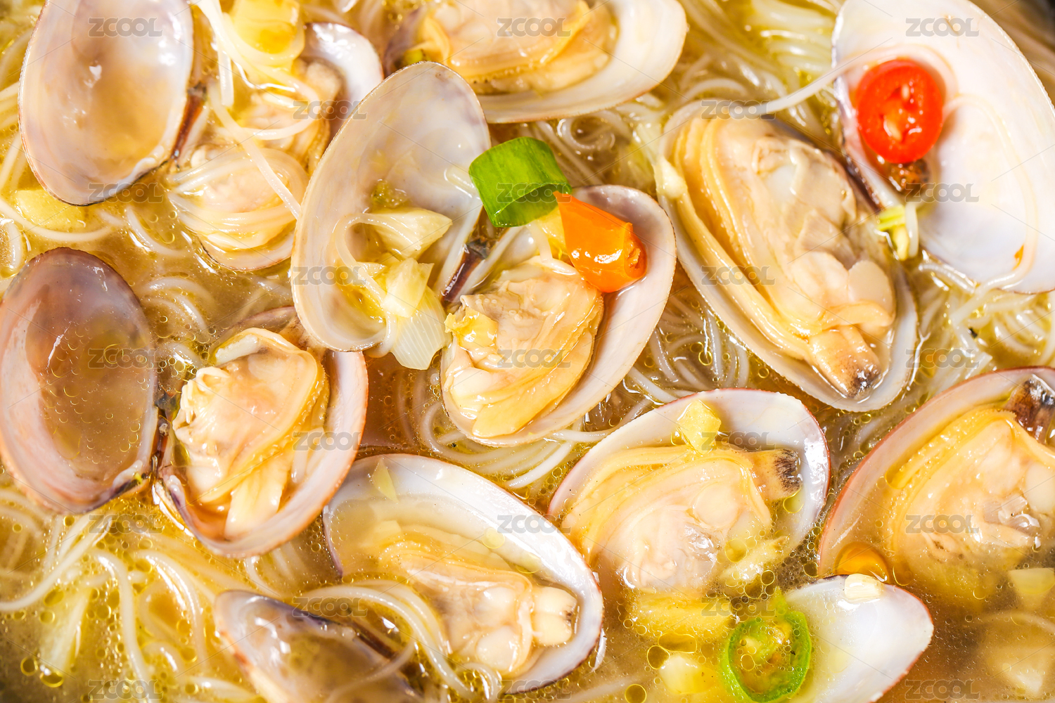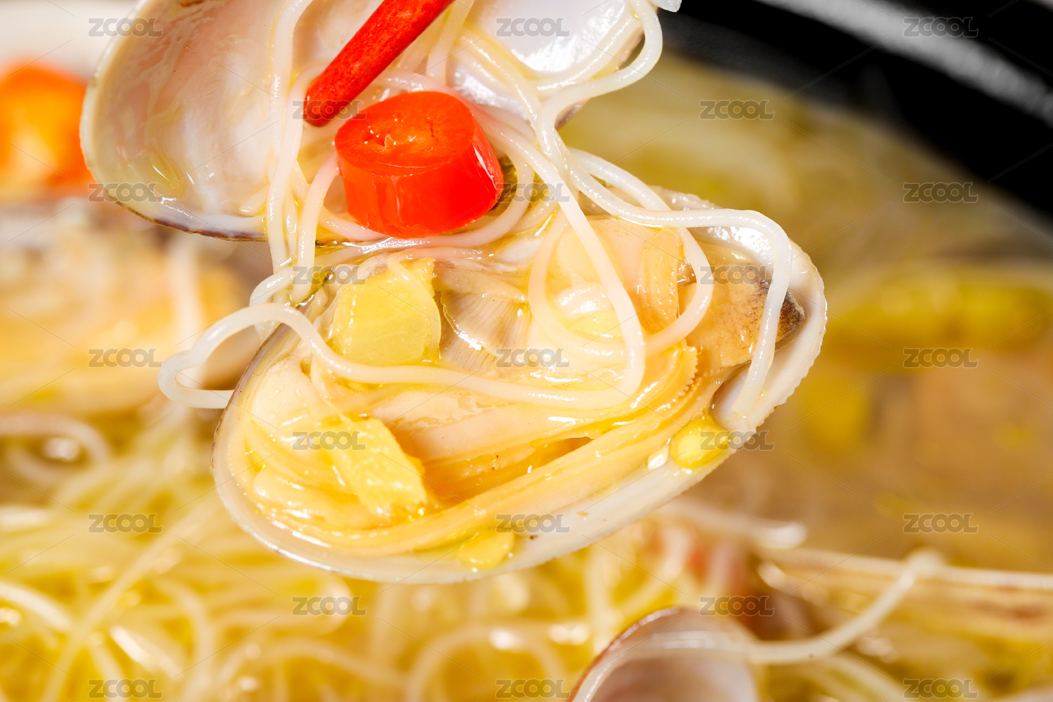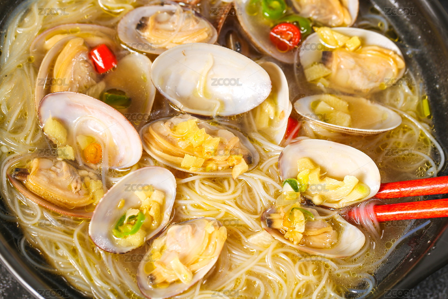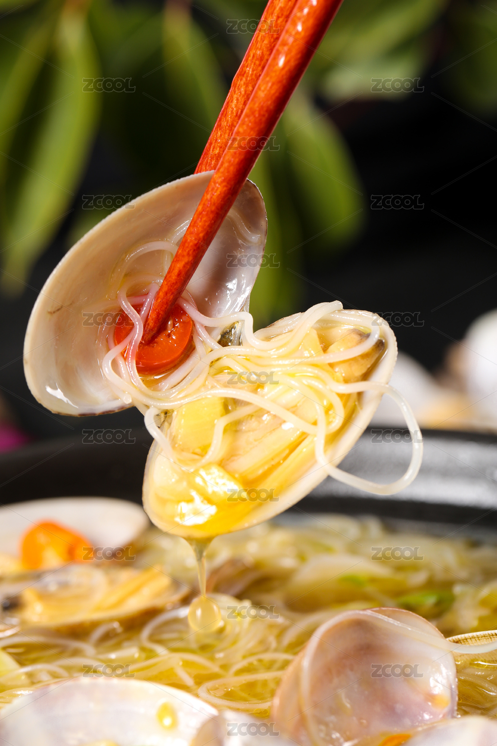 一碗花甲粉絲湯和筷子上夾著花甲