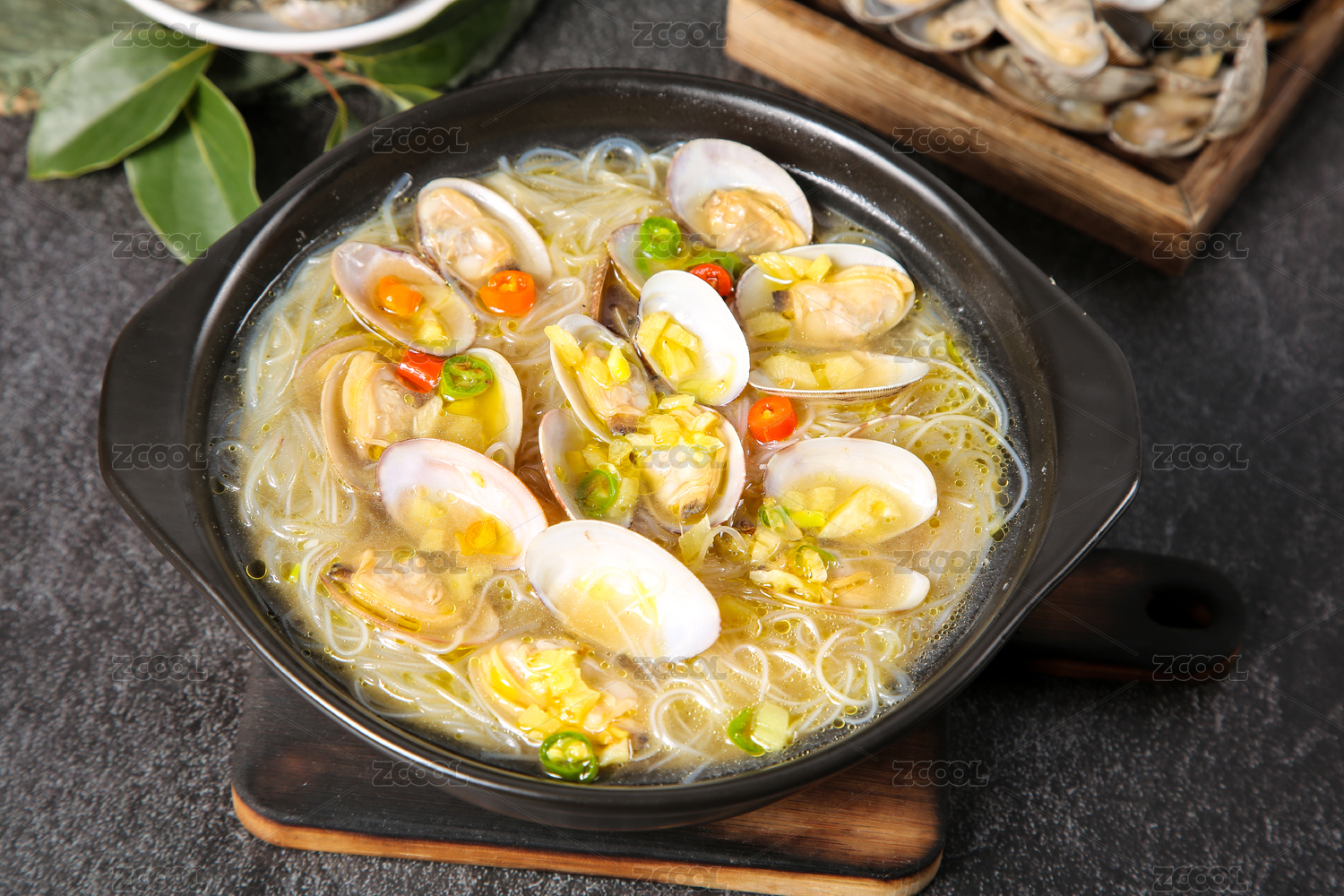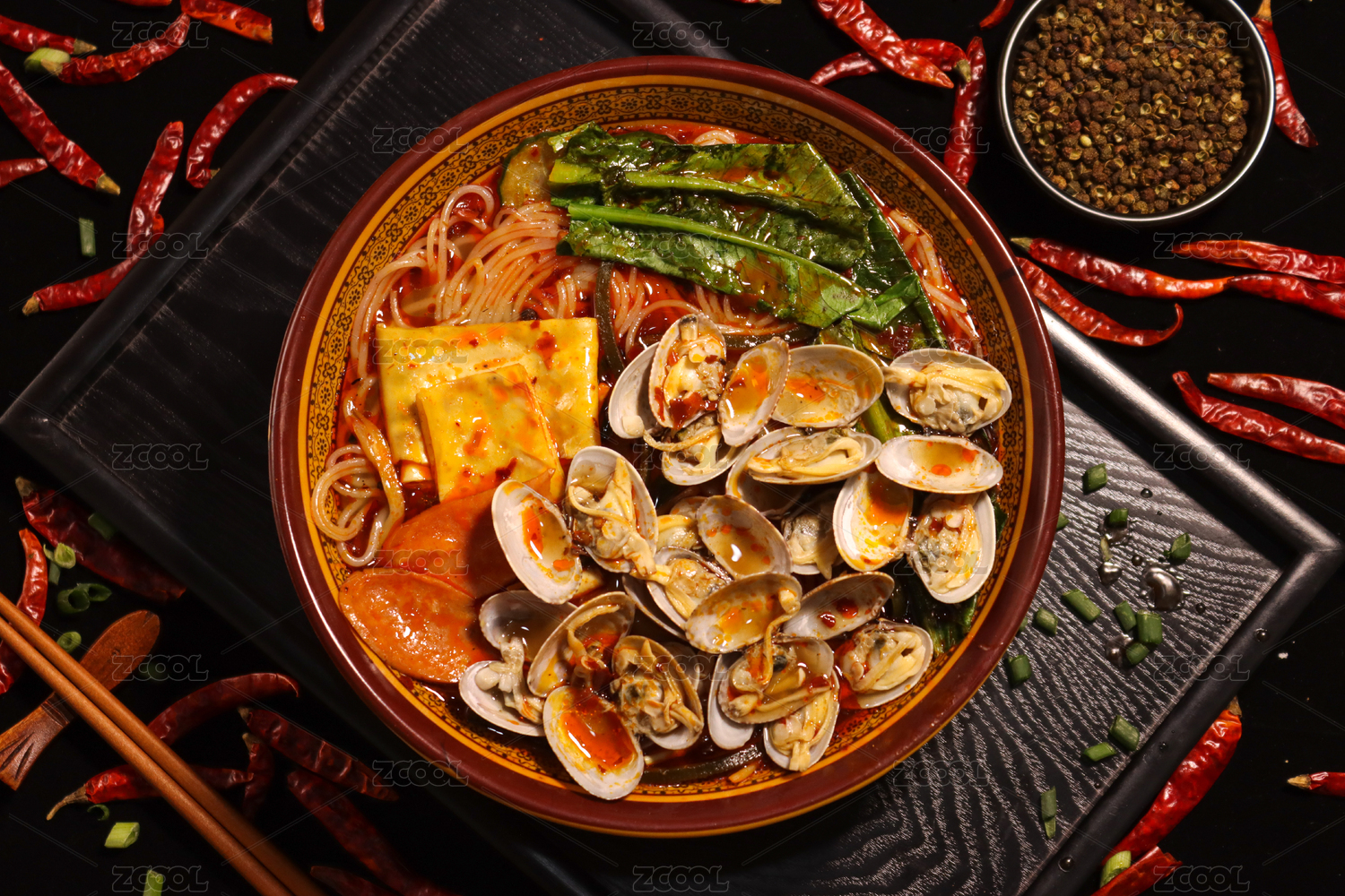黑底上放著一碗花甲米線砂鍋和筷子夾著花甲