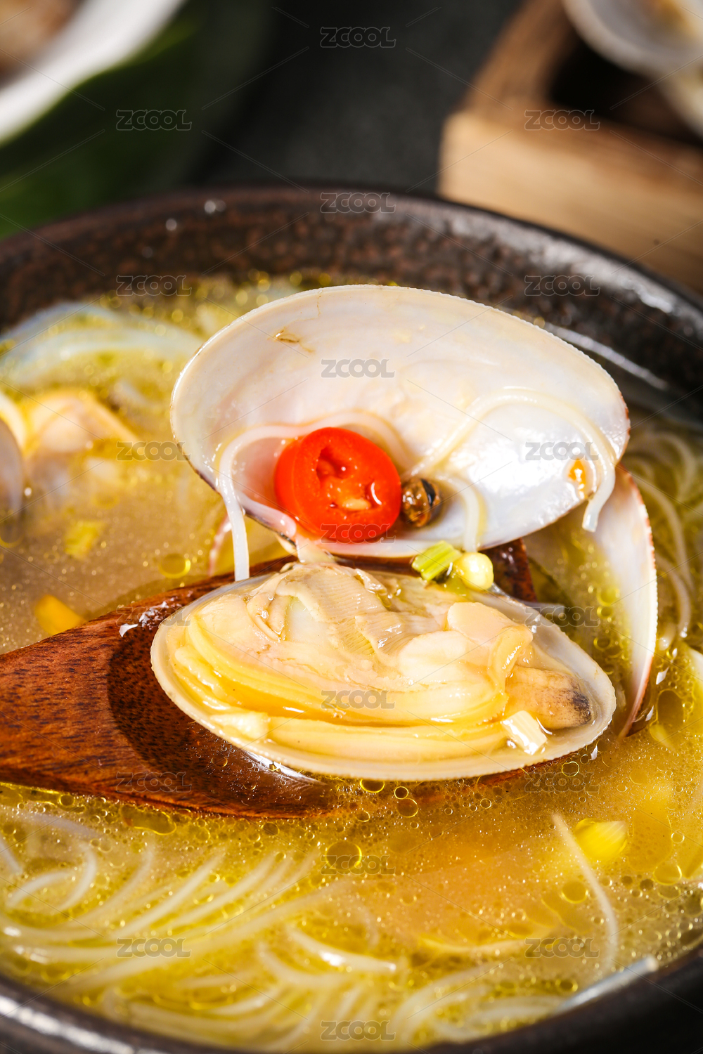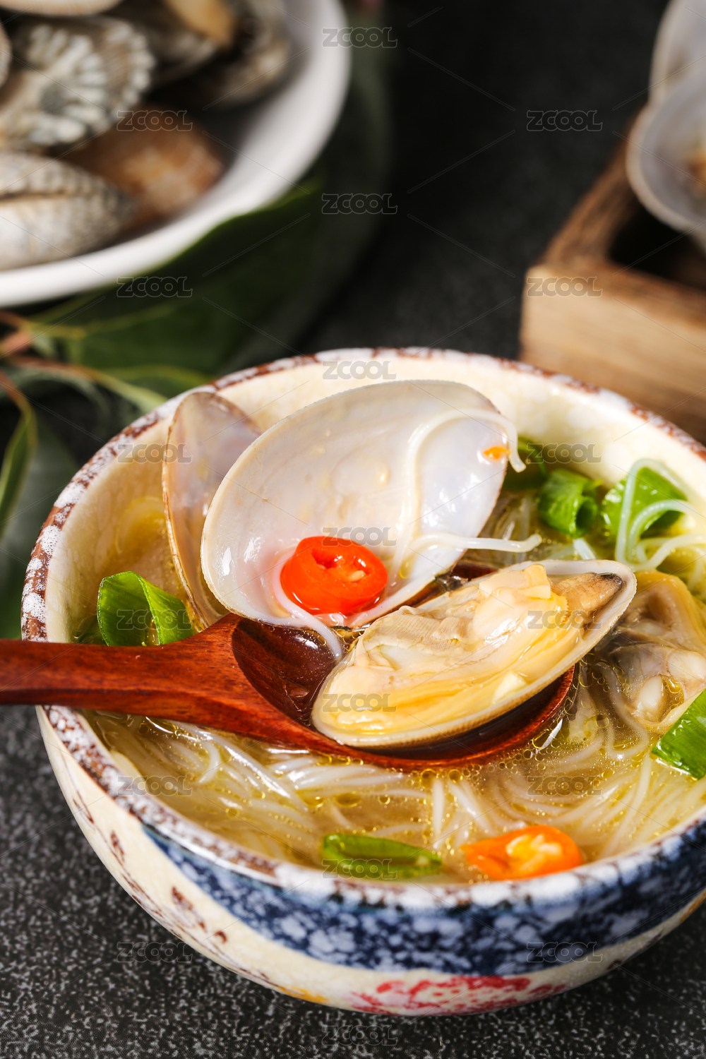 黑底上放著一碗花甲粉絲湯和勺子上挖著花甲
