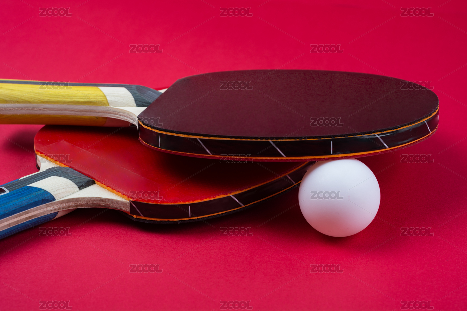 一副疊放的乒乓球拍與白色乒乓球,紅色背景