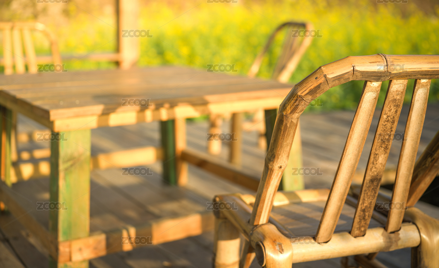 福建廈門海滄區(qū)天竺山木桌前的黃色花田