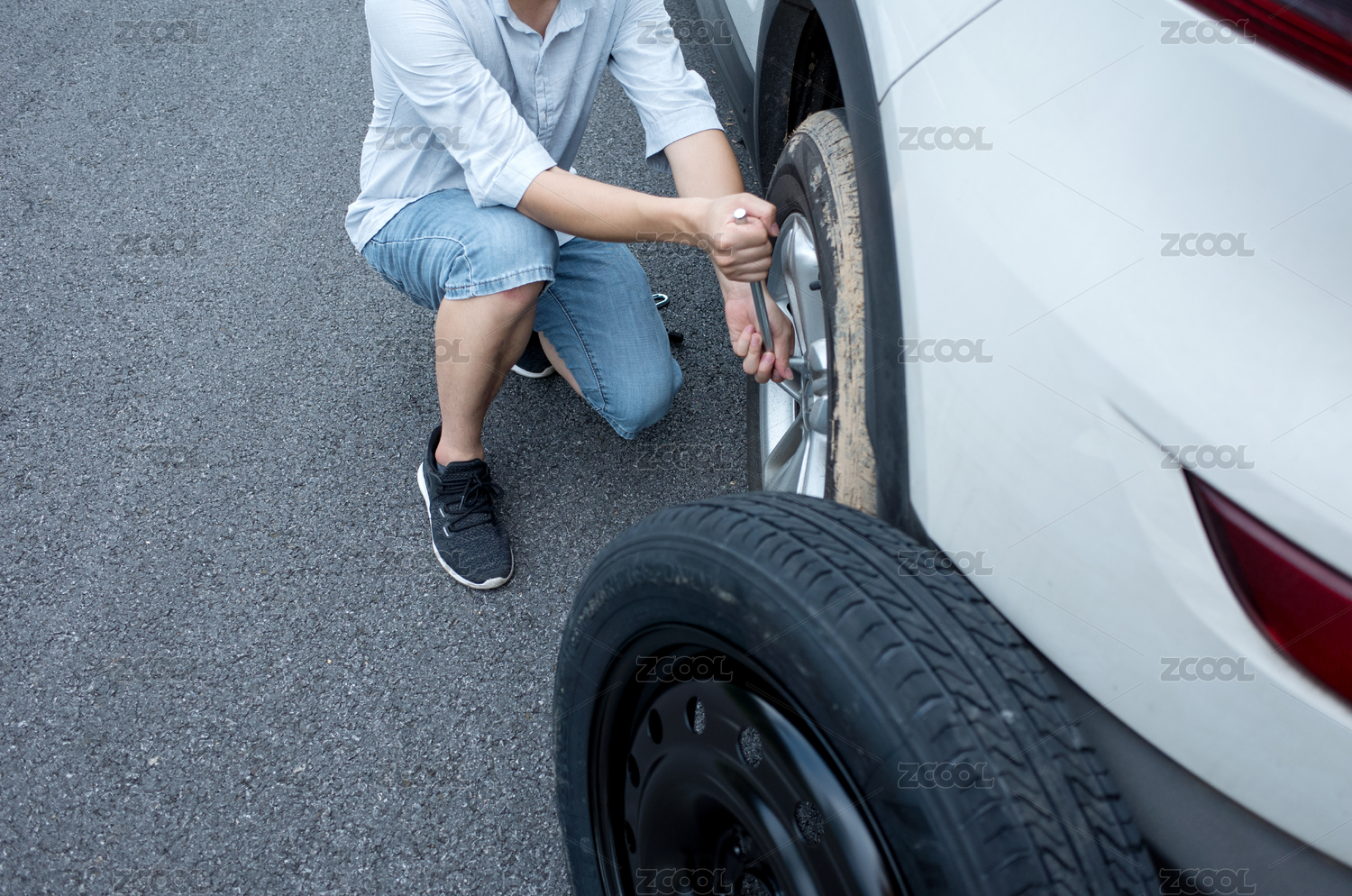 一個男青年正在給一輛因故障停在路邊的白色小汽車換輪胎