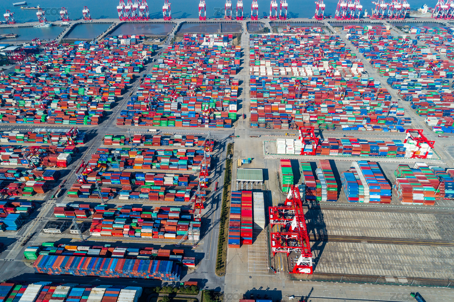 高視角俯瞰行駛中滿(mǎn)載集裝箱的大型貨船