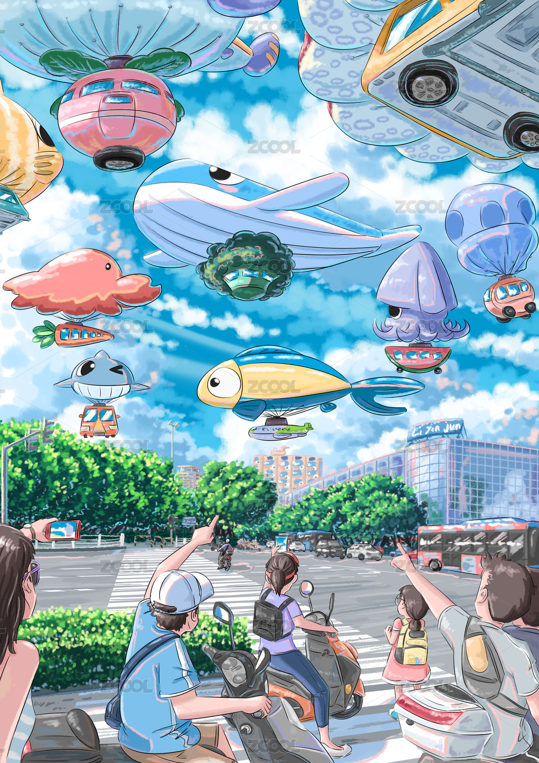 鯨魚在天空飛翔,天空之境,唯美奇幻插畫
