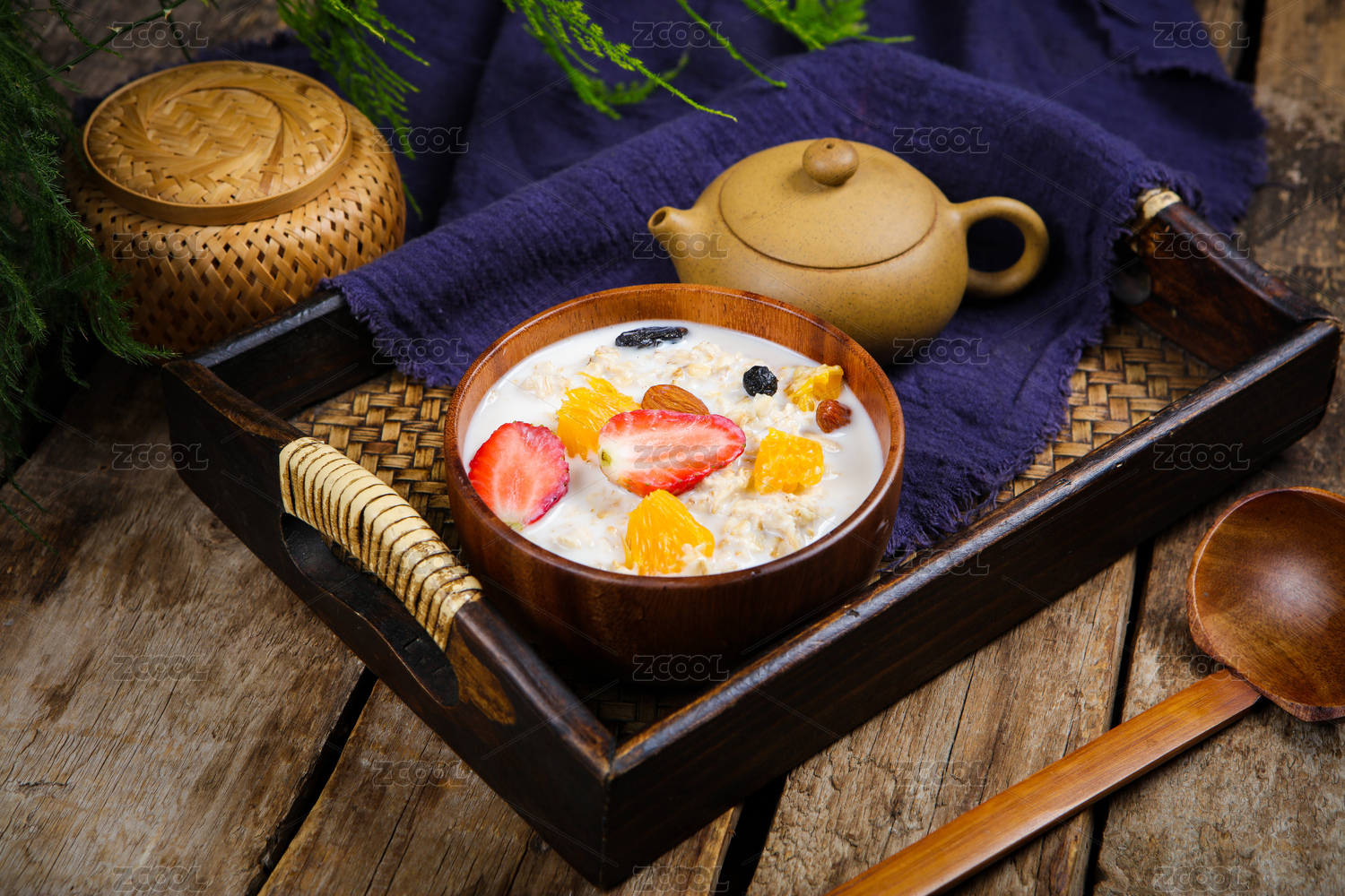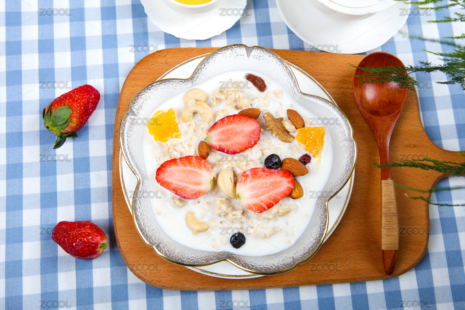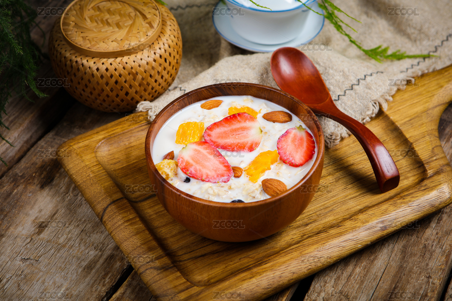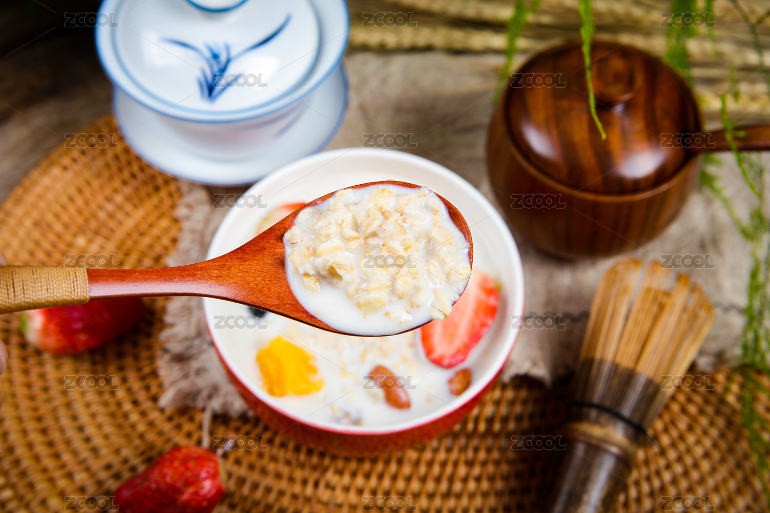 木勺子舀起來的牛奶水果草莓藍(lán)莓泡燕麥