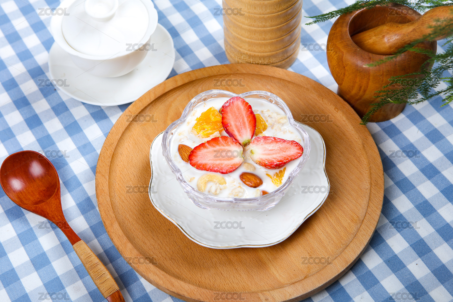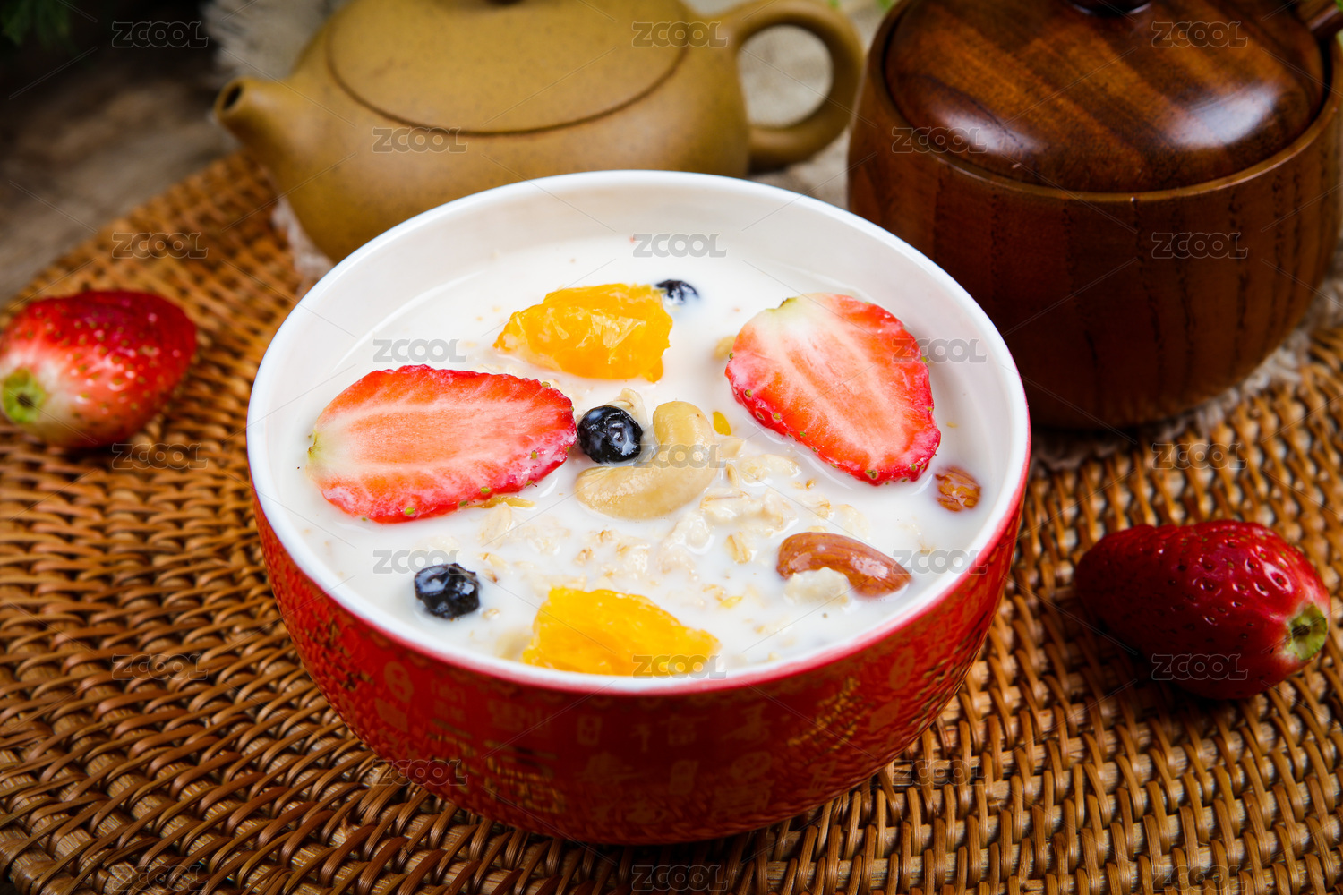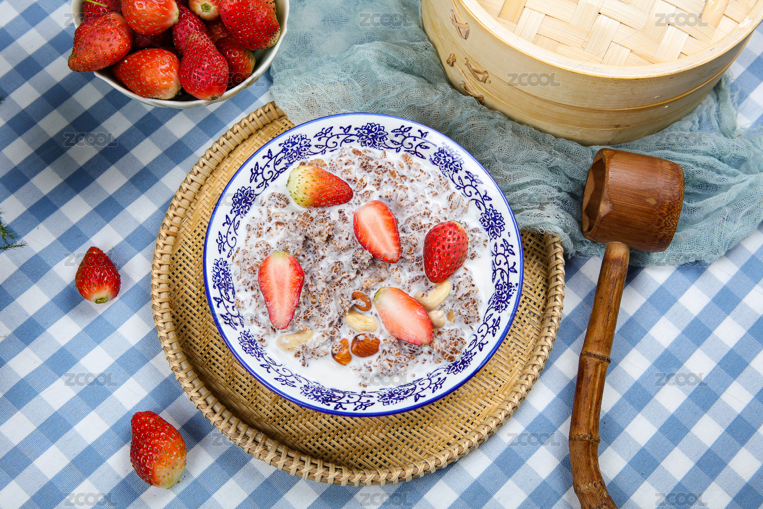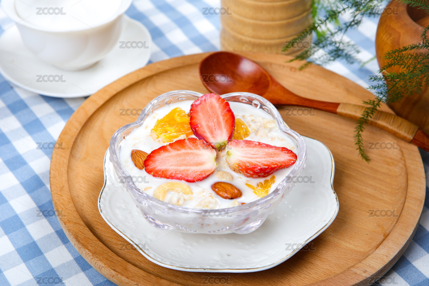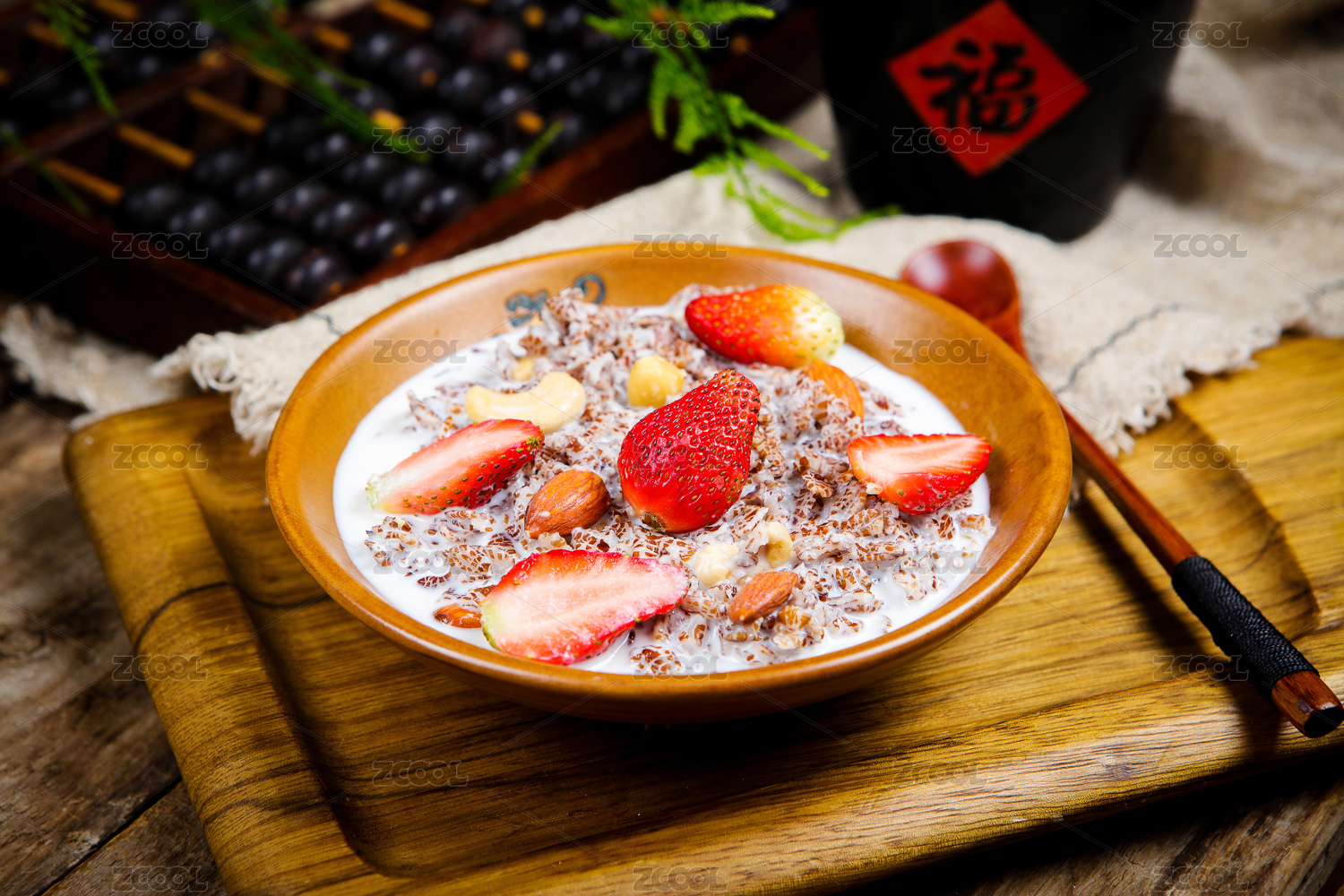 木勺子舀起來的牛奶水果草莓藍(lán)莓泡燕麥