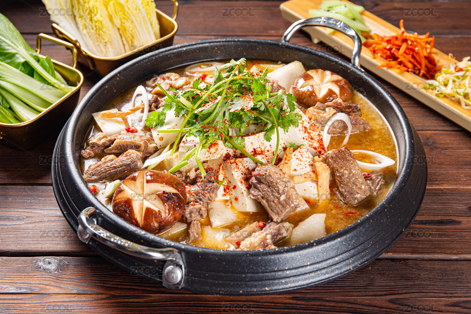 木制背景上的日式火鍋與牛肉