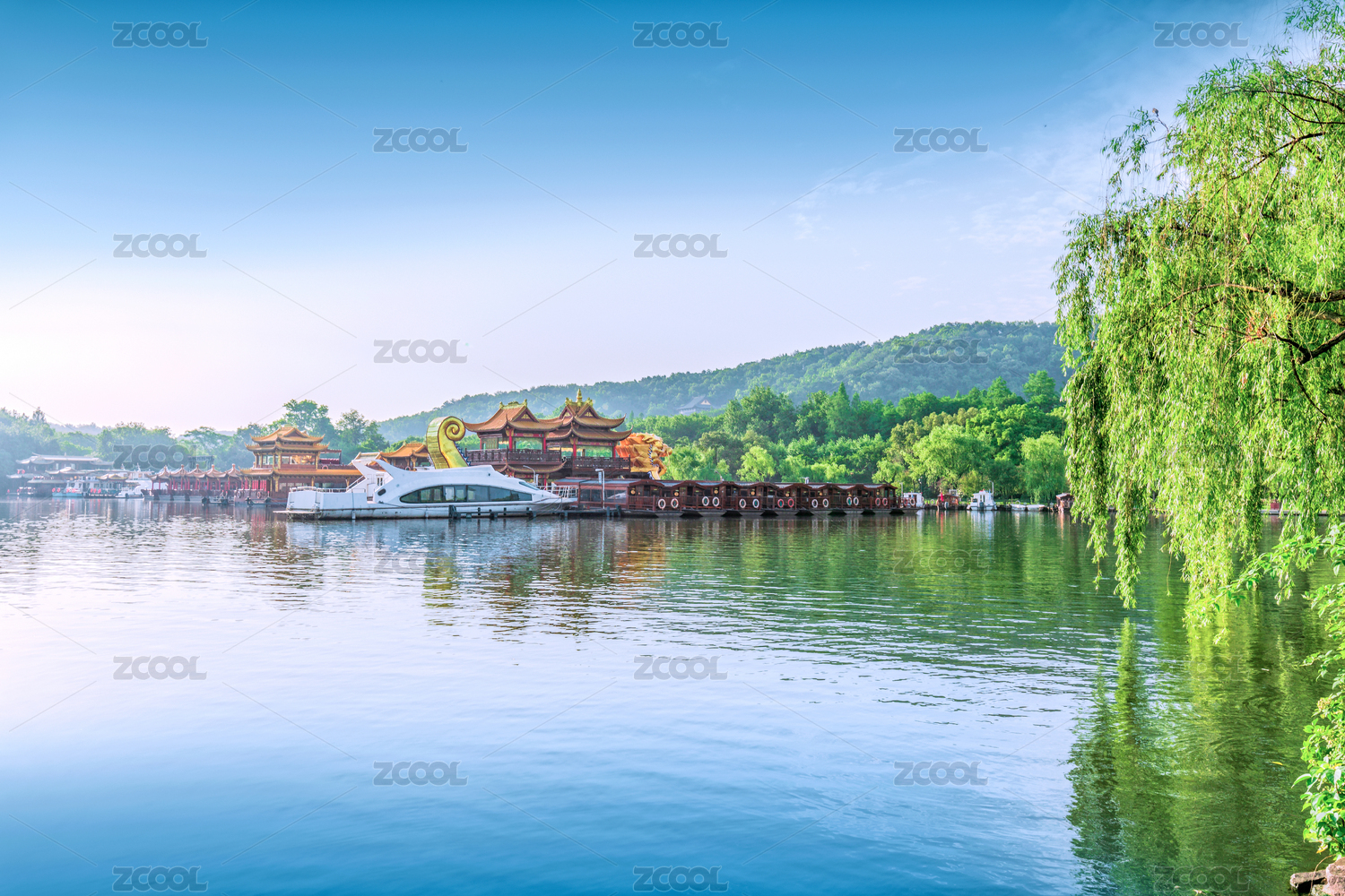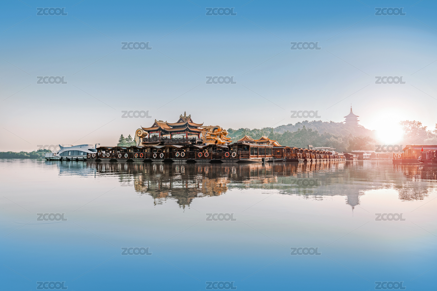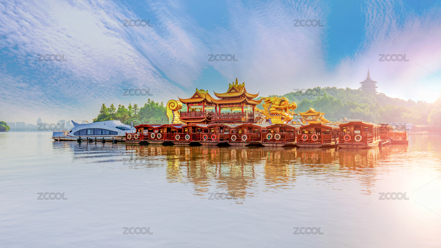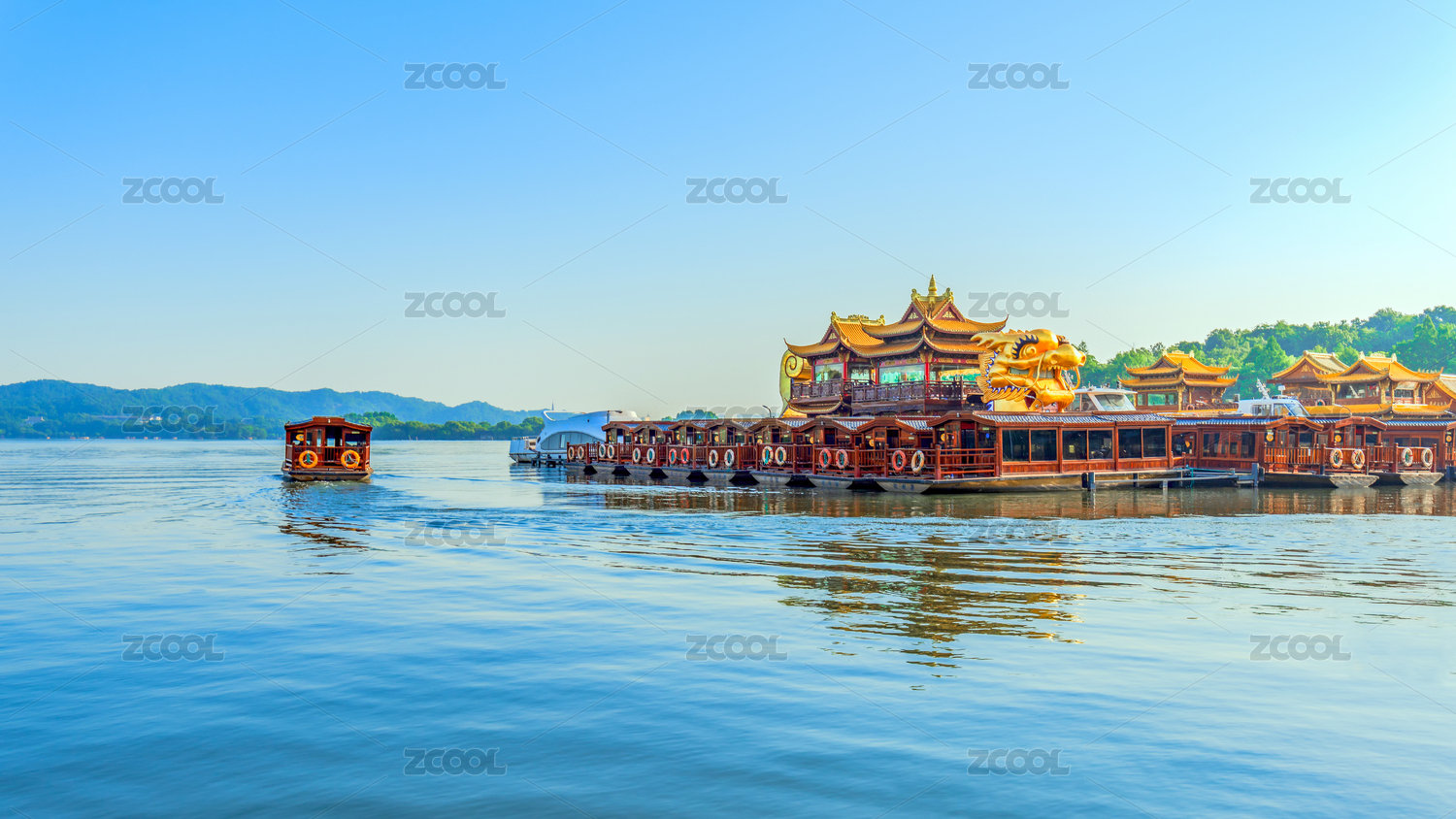 中國(guó)浙江杭州西湖,碼頭停泊的游船與畫(huà)舫