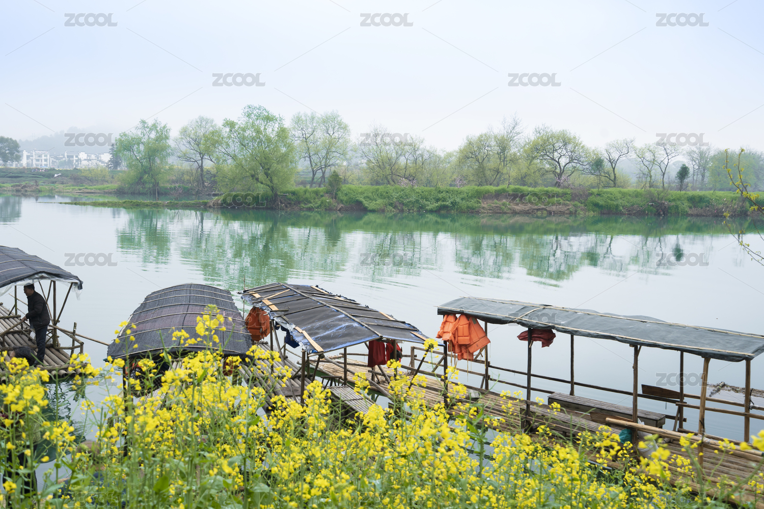 春季月亮灣停泊的游船及前景的油菜花,中國(guó)江西婺源