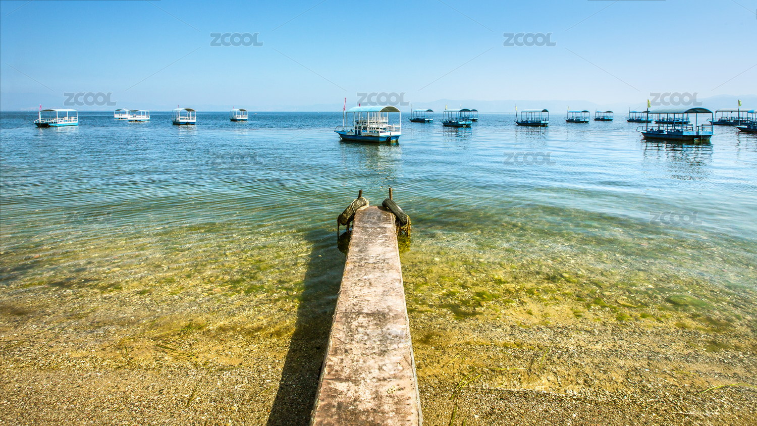 中國(guó)云南省玉溪市撫仙湖畔冬日溫暖的陽(yáng)光下停泊的游船