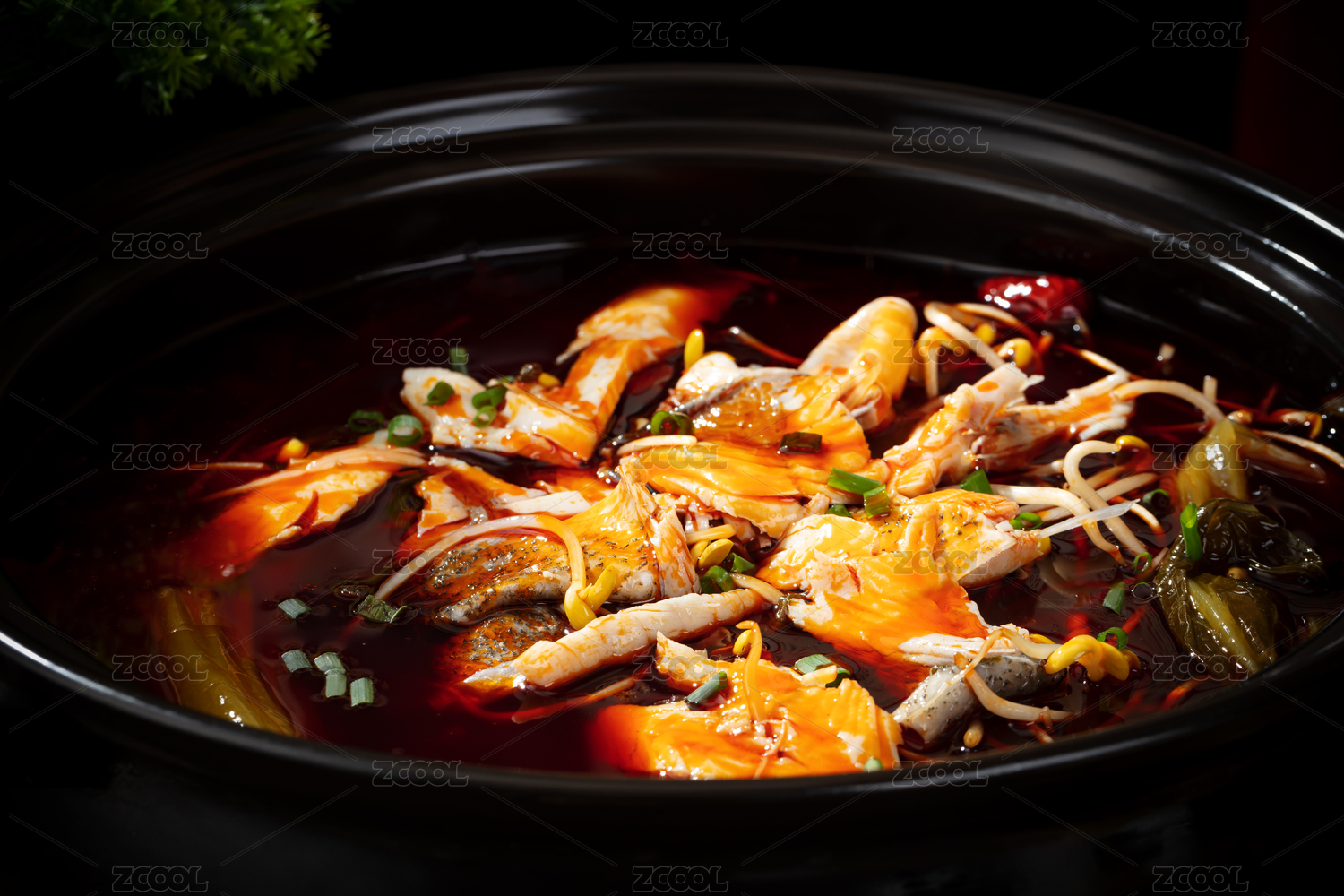 黑色砂鍋里的麻辣火鍋魚片水煮魚片