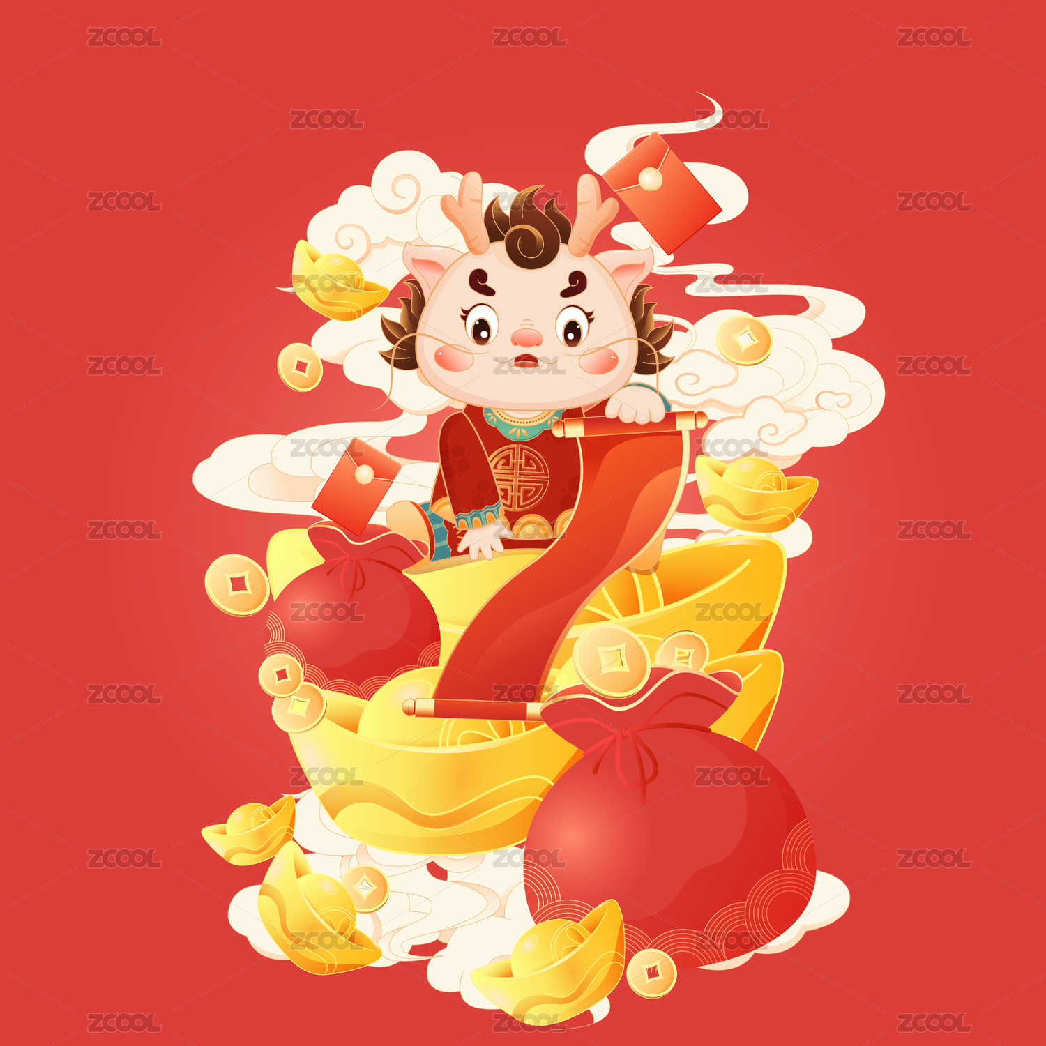 龍年新年春節(jié)抱一堆元寶的小龍