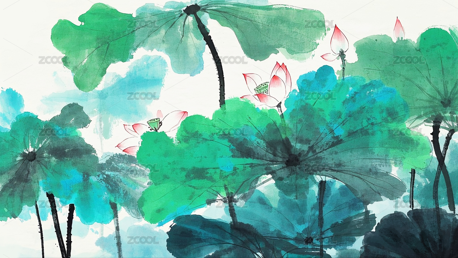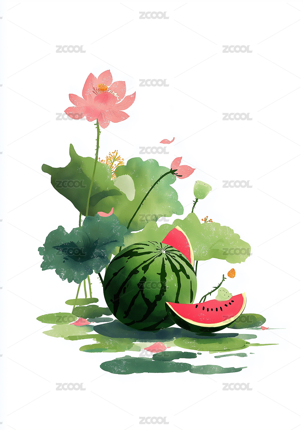 西瓜蓮葉池塘水彩畫