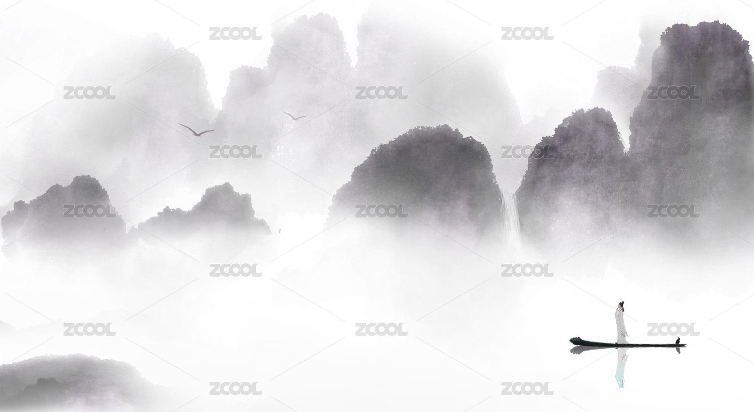 水墨山水畫卷公子乘舟江中游