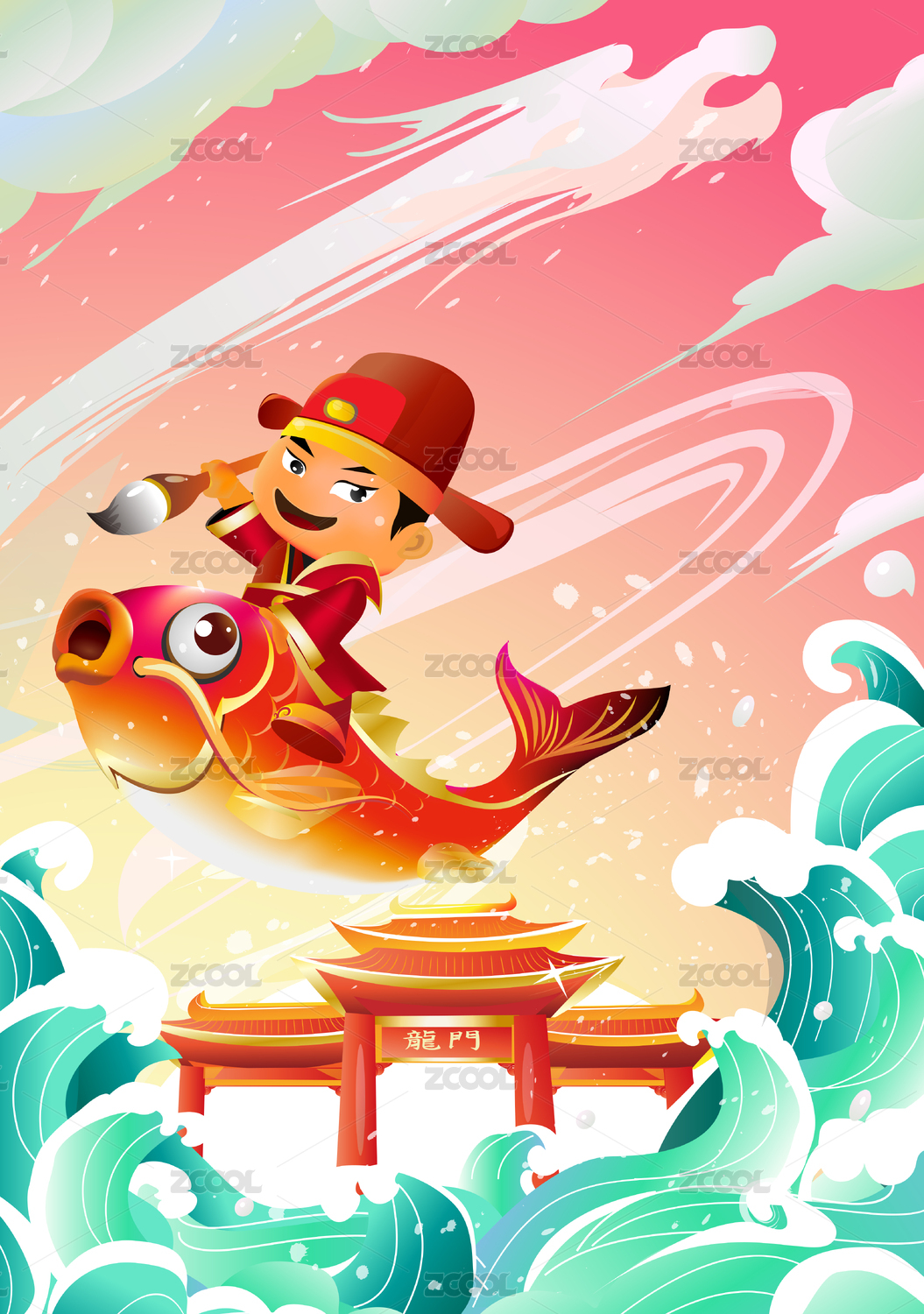 中國古代狀元騎著鯉魚跳過龍門
