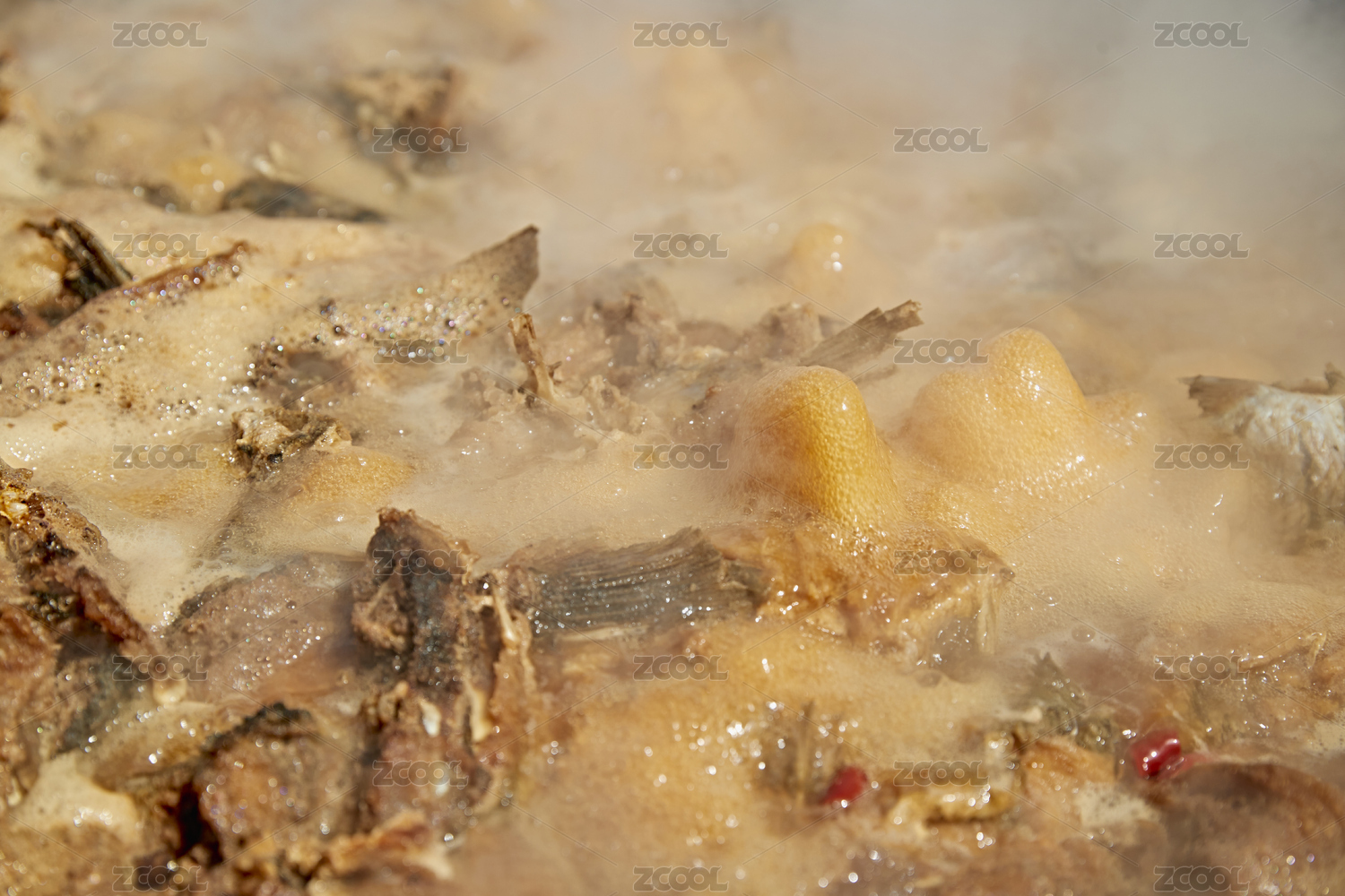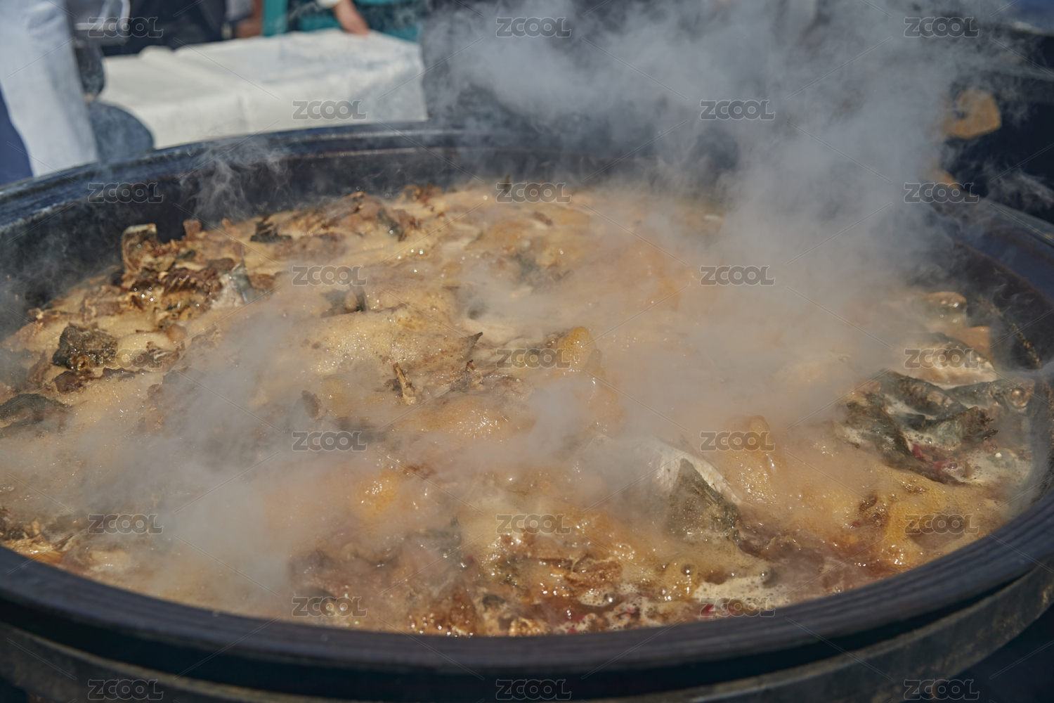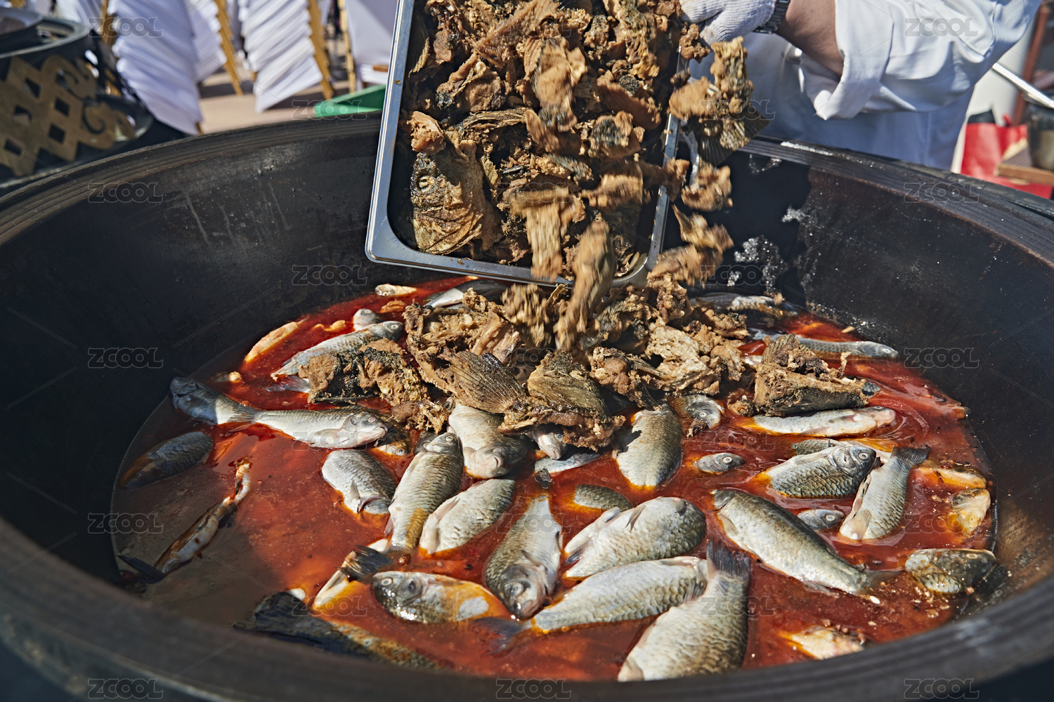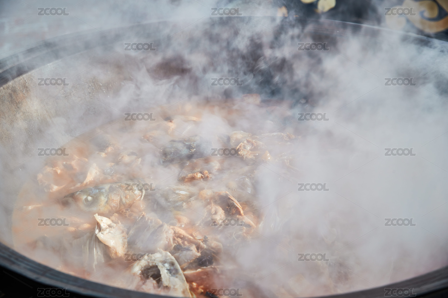 戶外柴火鐵鍋燉煮的剛捕撈的野生魚湯
