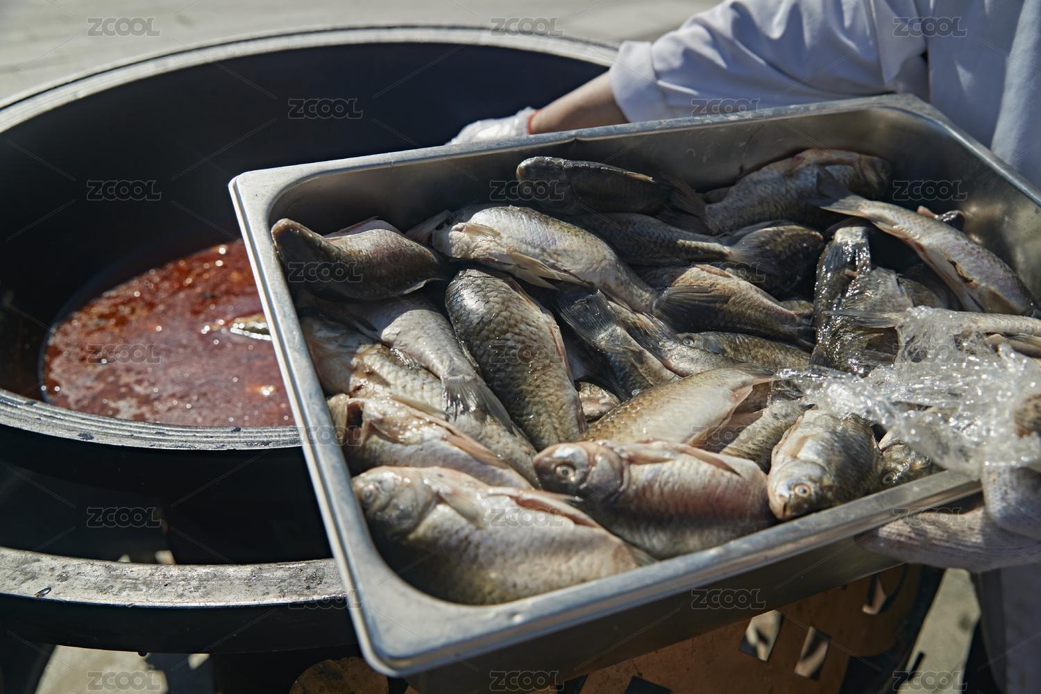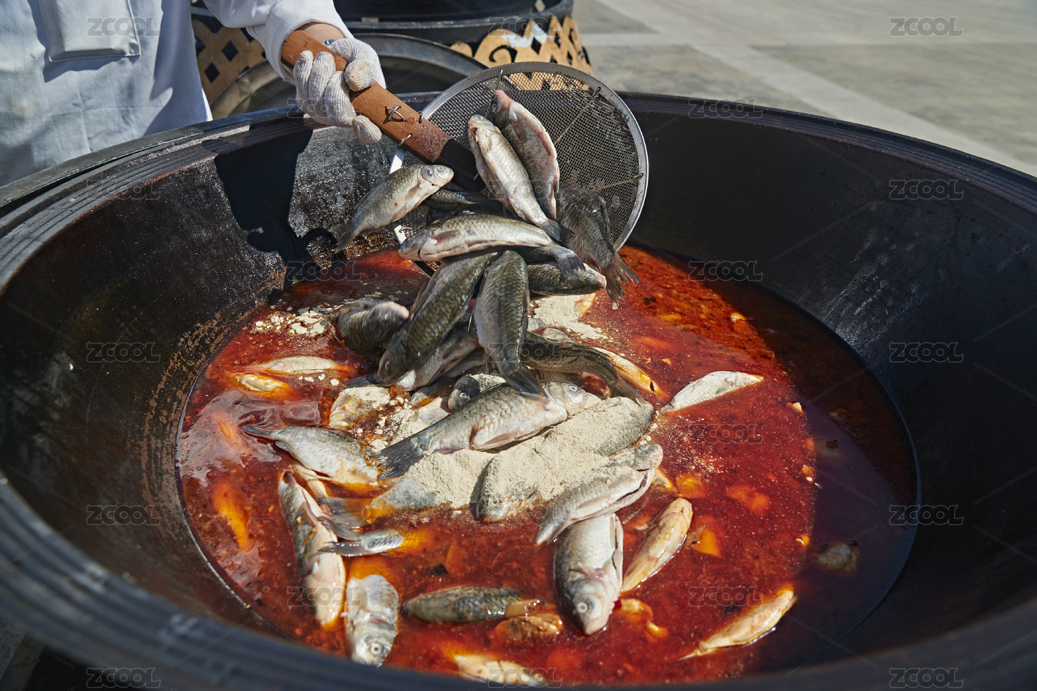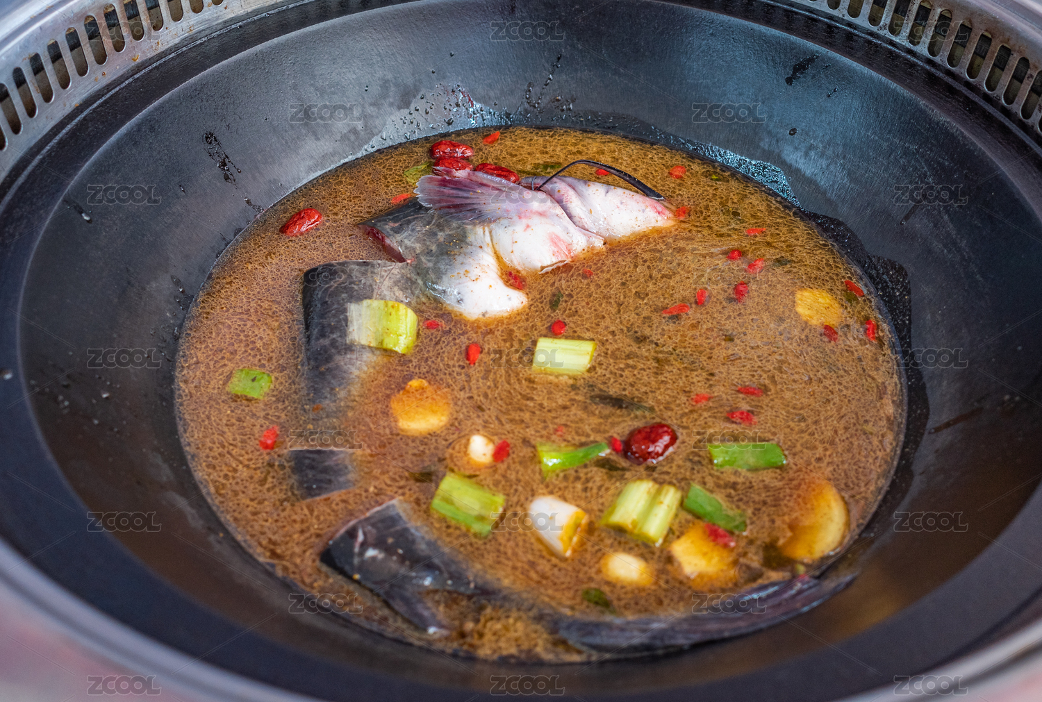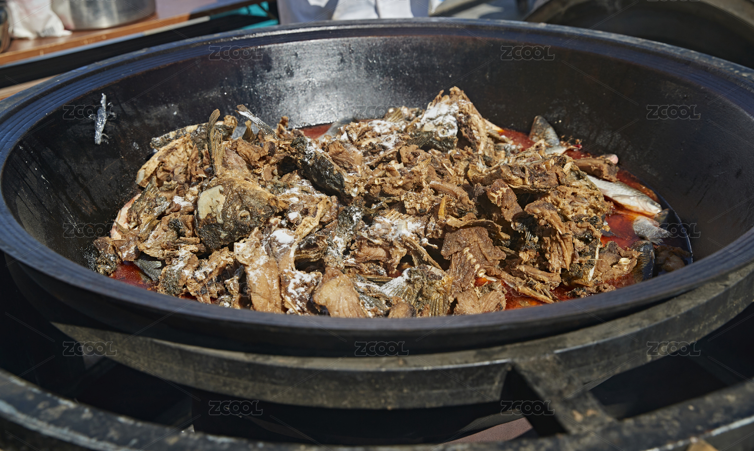 戶外柴火鐵鍋燉煮的剛捕撈的野生魚