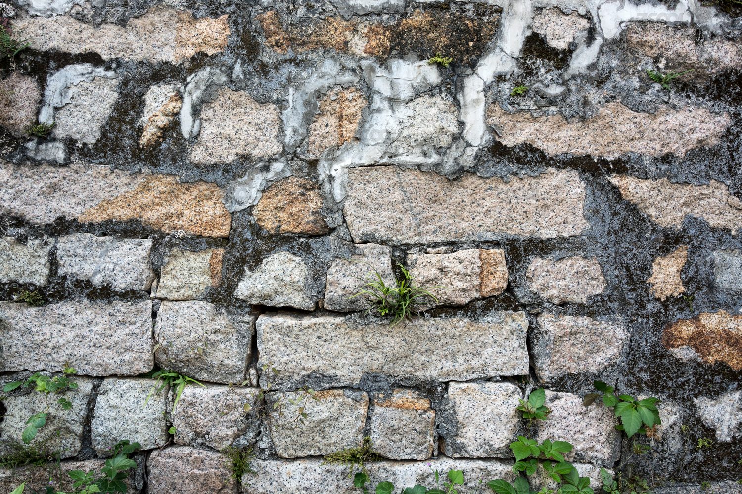 帶綠植的斑駁石墻紋理
