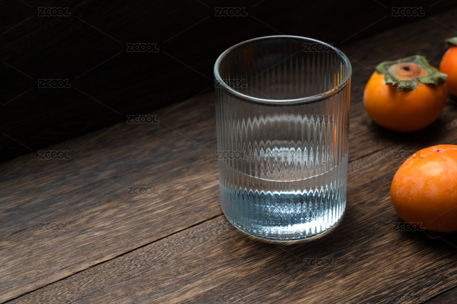 一杯水和幾個柿子擺放在木桌上留白