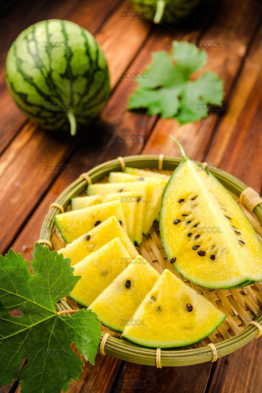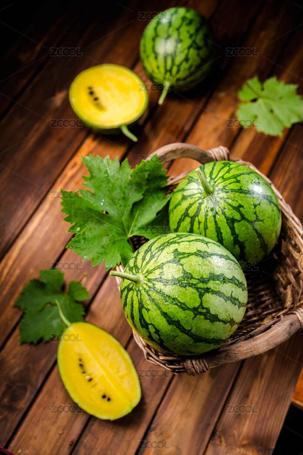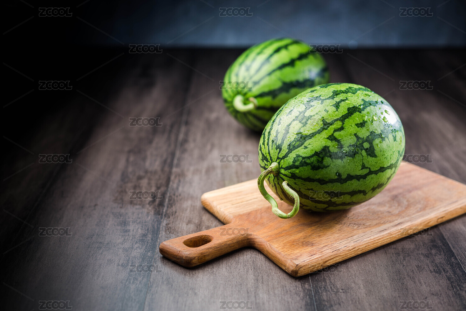 棕色木桌上放著幾枚西瓜