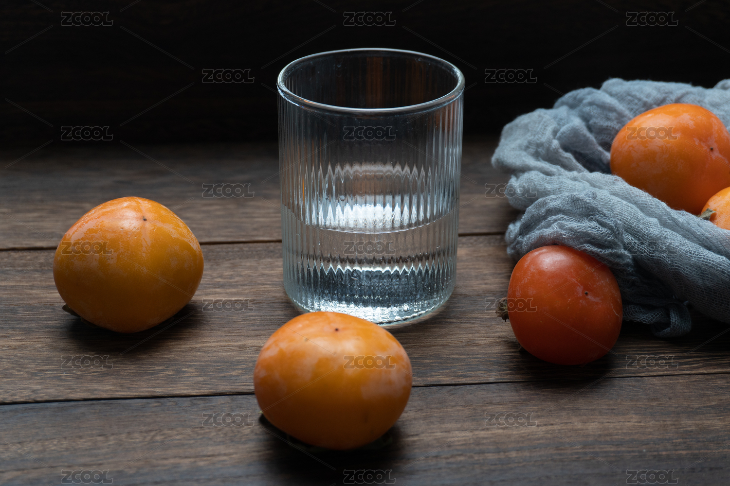 一杯水和幾個香甜可口的秋柿子擺放在木桌上