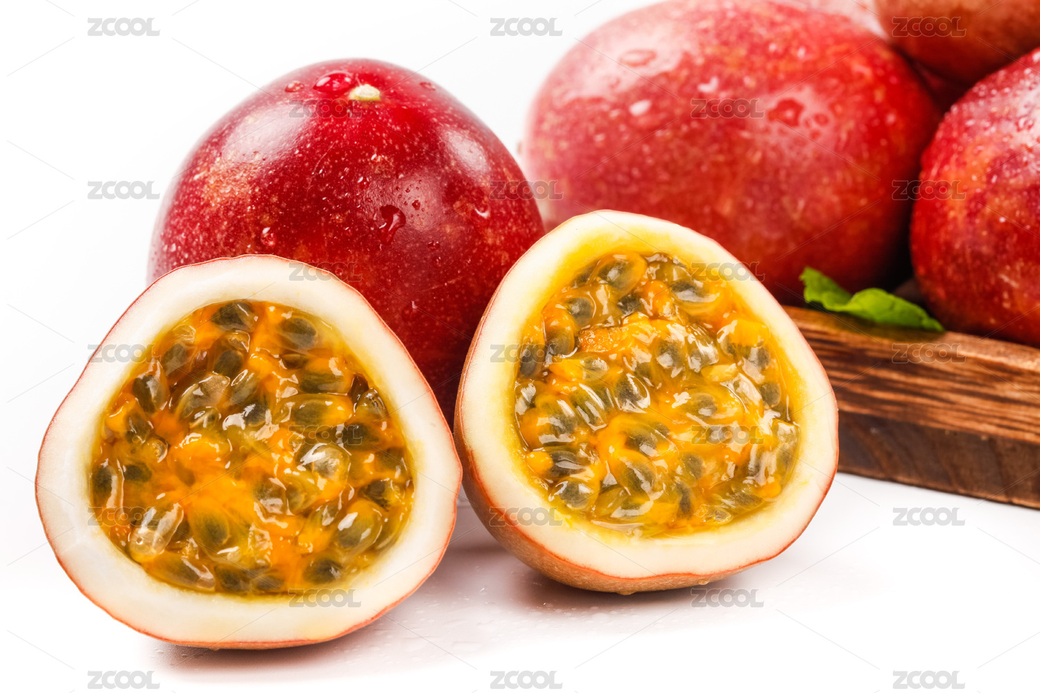 白底上放著一木盒百香果和幾個切半的果肉