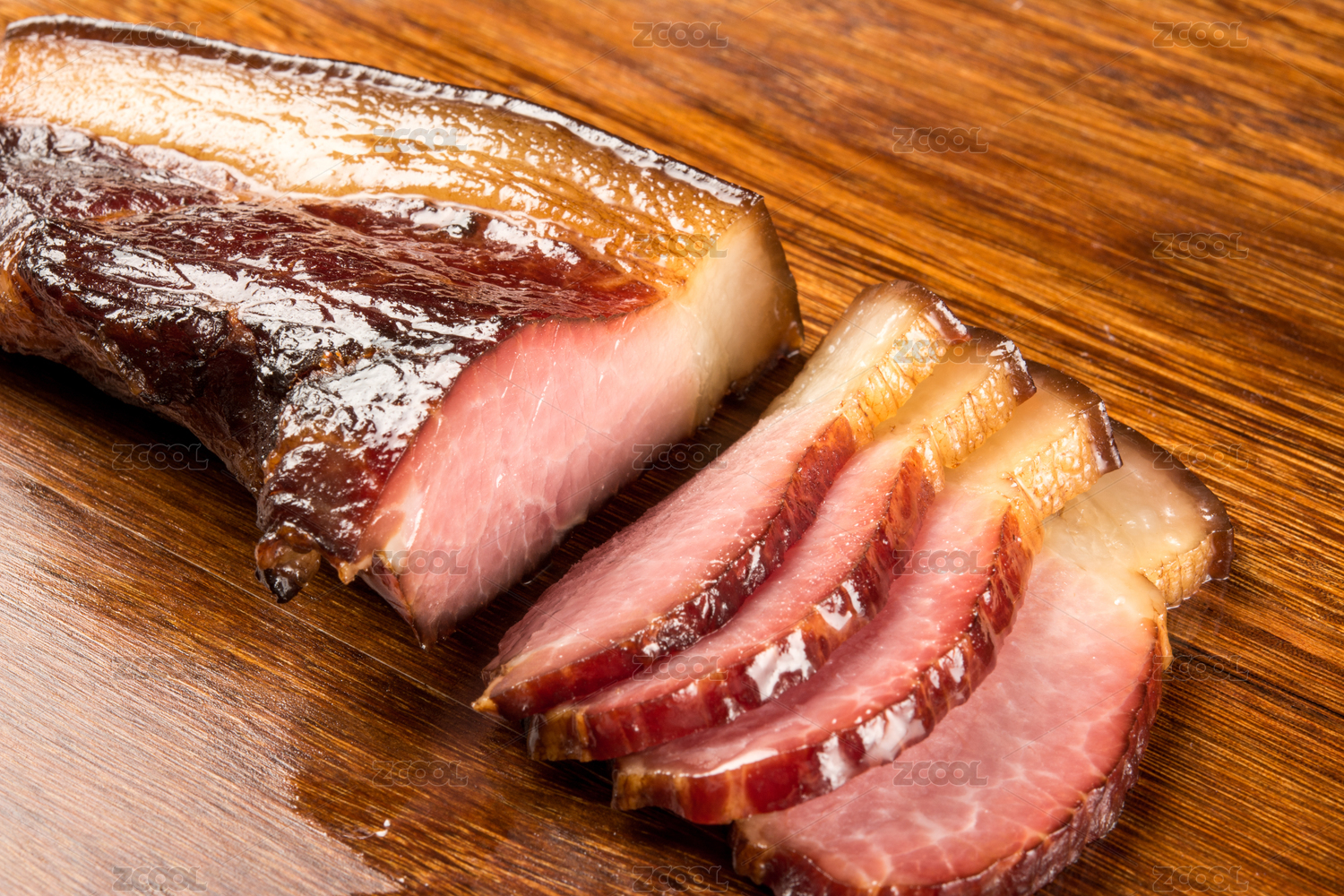 木砧板上放著一塊整的豬后腿臘肉和幾片切成片的豬后腿臘肉