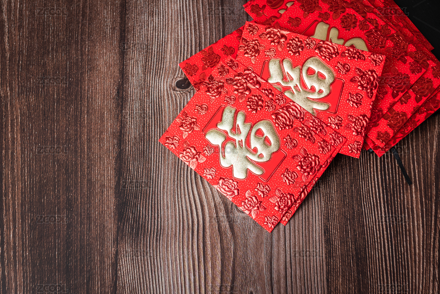 幾個寫著祝福語的紅包放在木桌面上