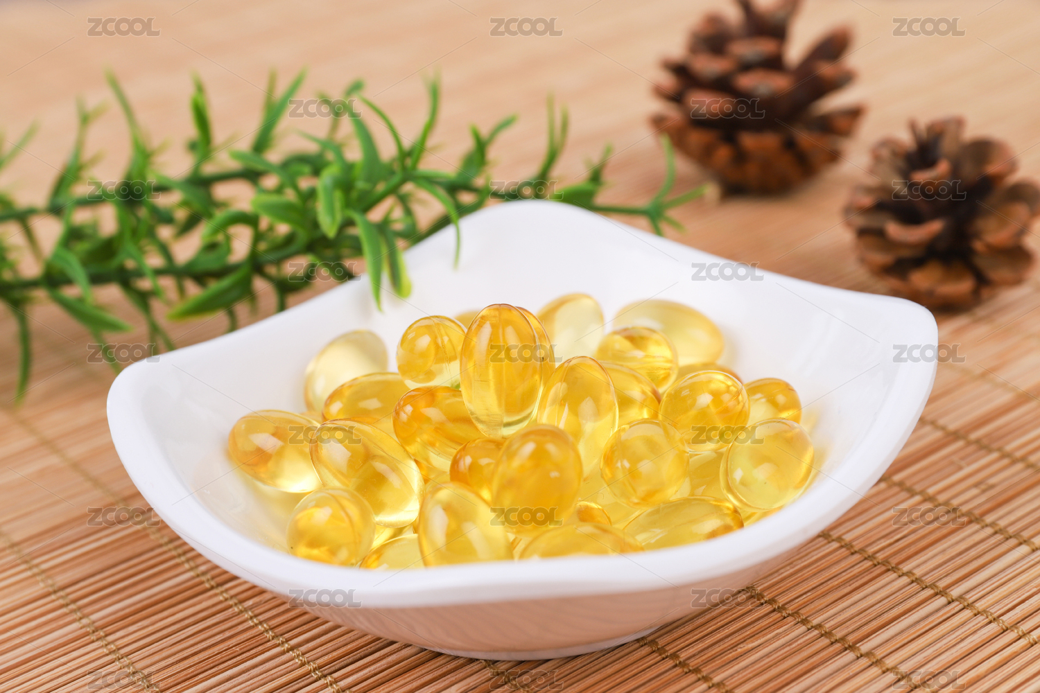 竹簾背景上小碟子里的黃色透明膠囊