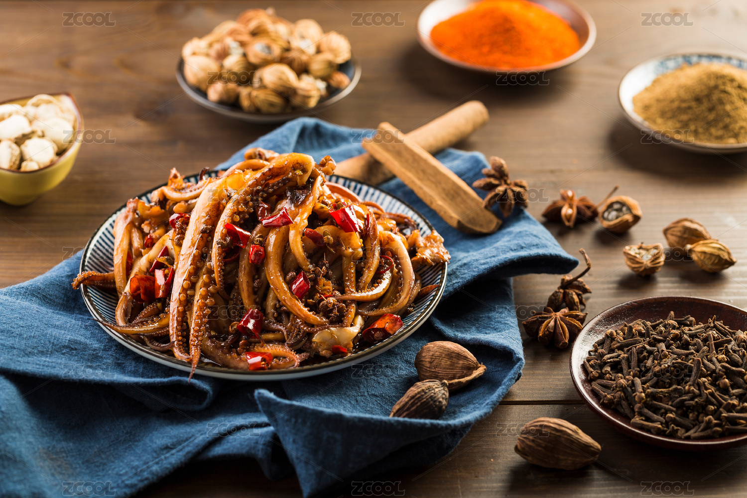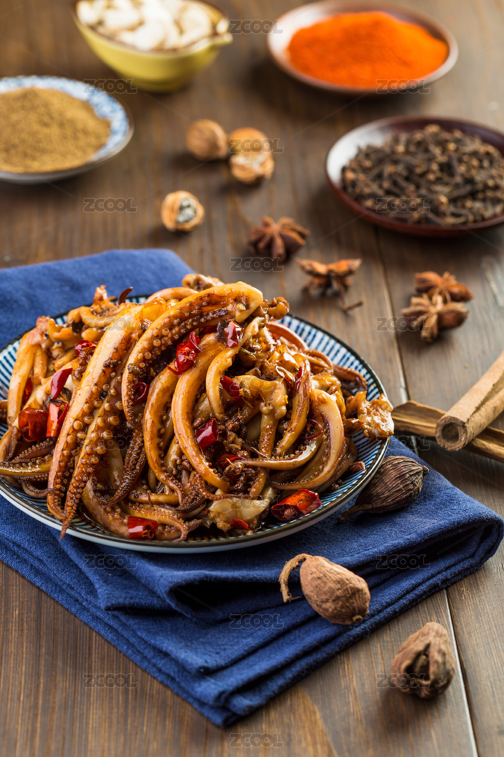 中國(guó)家常菜,一碟香辣魷魚(yú)在木桌子上