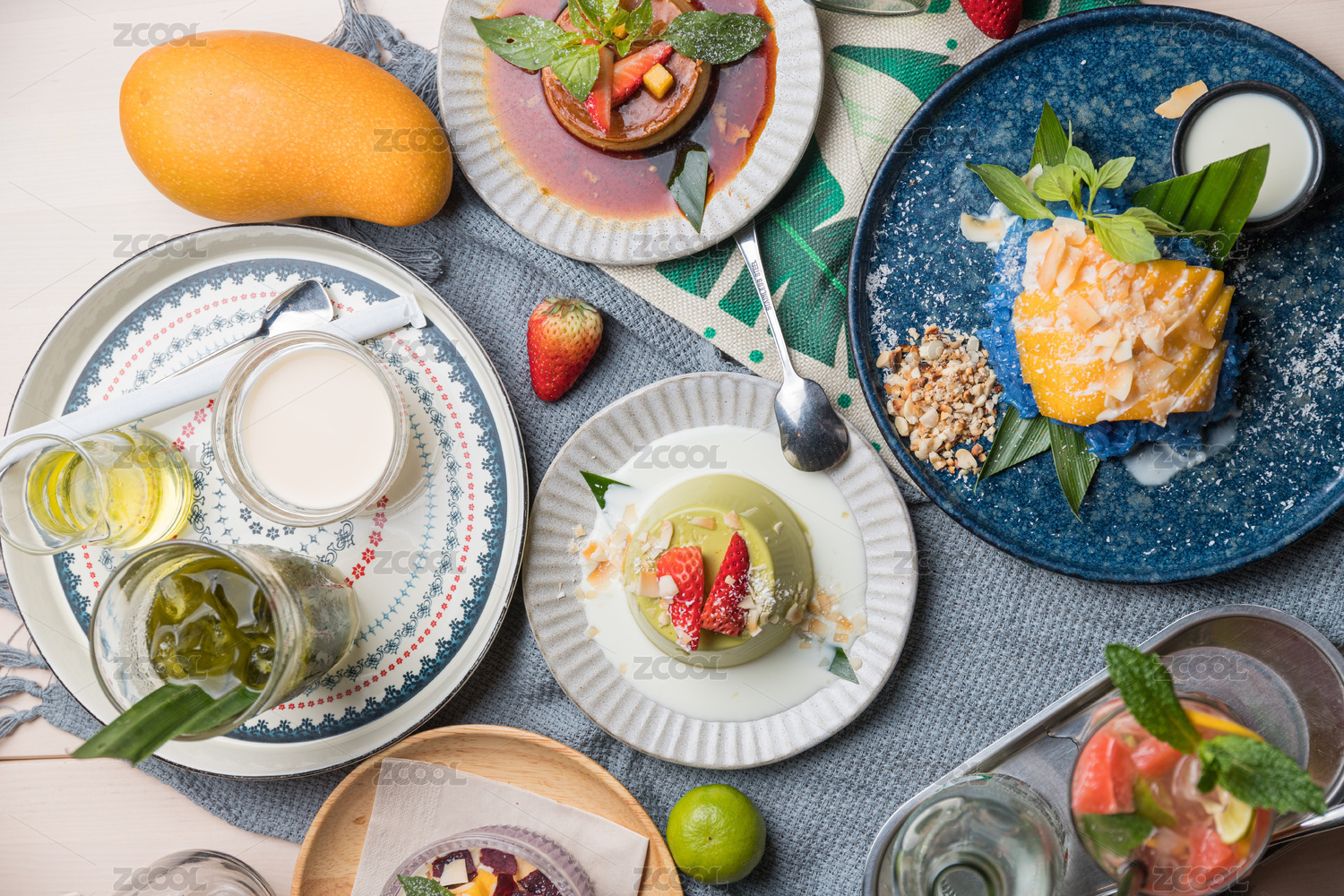 桌子上擺滿了泰式甜點(diǎn)俯拍
