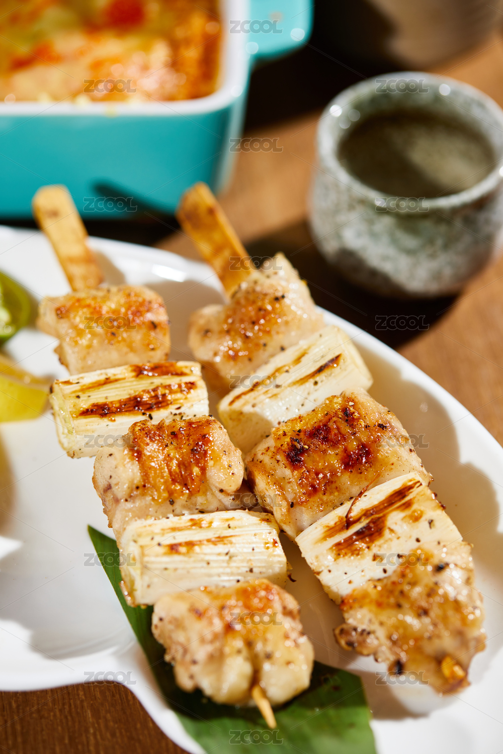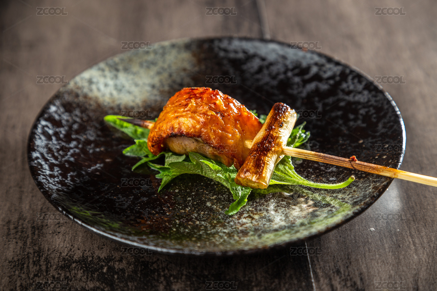 黑色木紋桌面上有一份京蔥烤雞腿肉