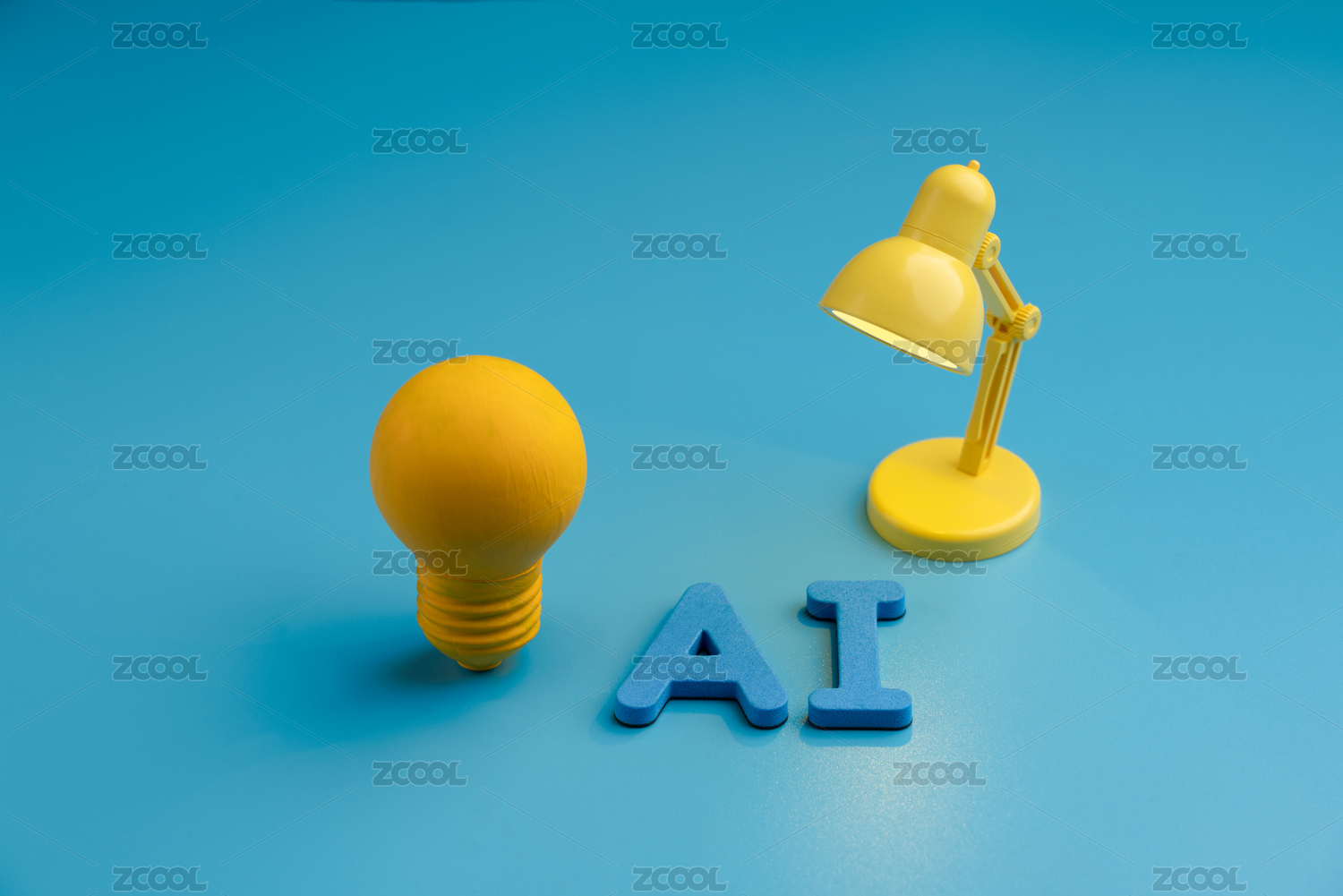 黃色的燈泡臺燈下放著藍色的AI字母微縮創(chuàng)