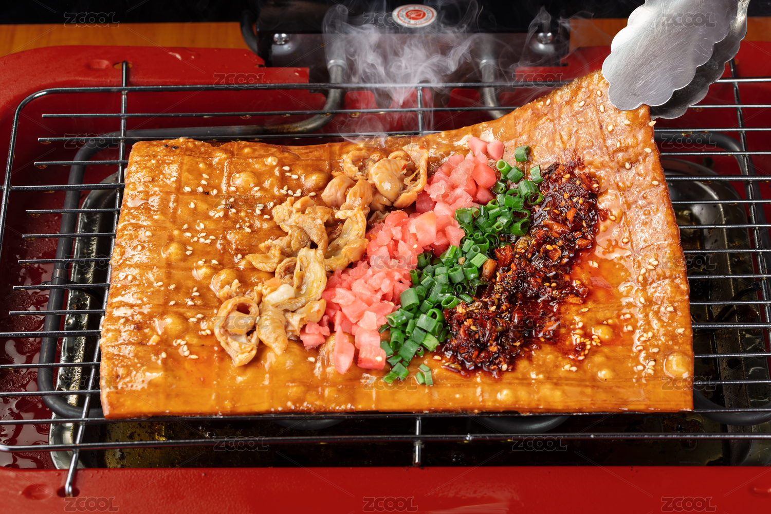 正在燒烤架上烤的重慶小吃烤豆干卷紅燒肥腸