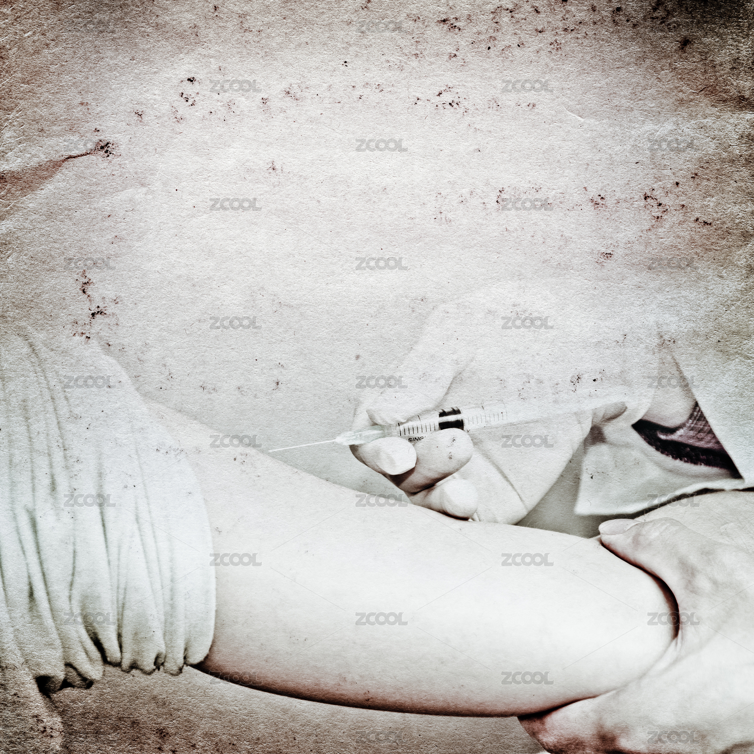 與患者手的舊垃圾紙張紋理背景醫(yī)生注射疫苗