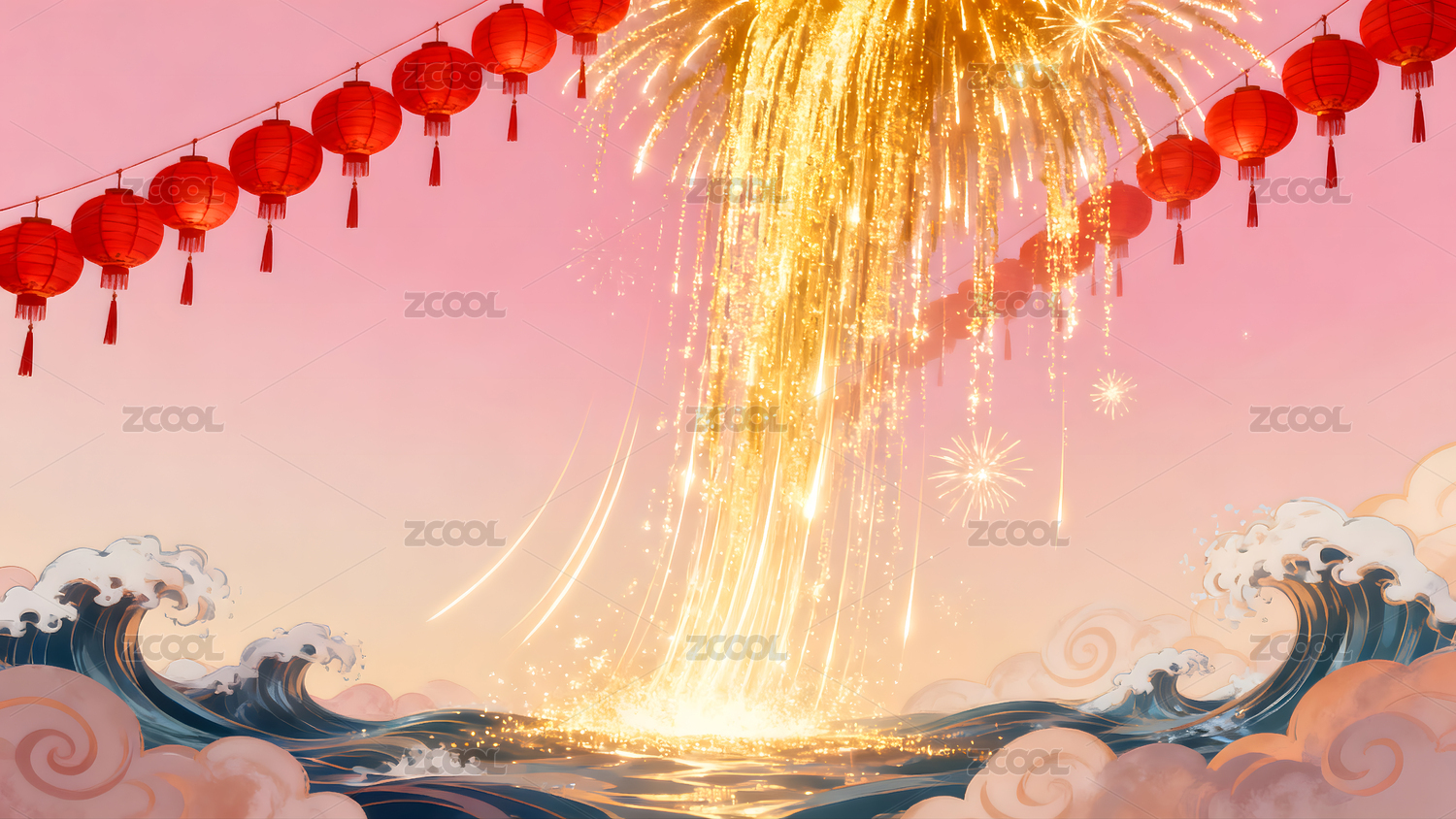 扁平風(fēng)水彩插畫壁紙背景海上明月雙兔迎新