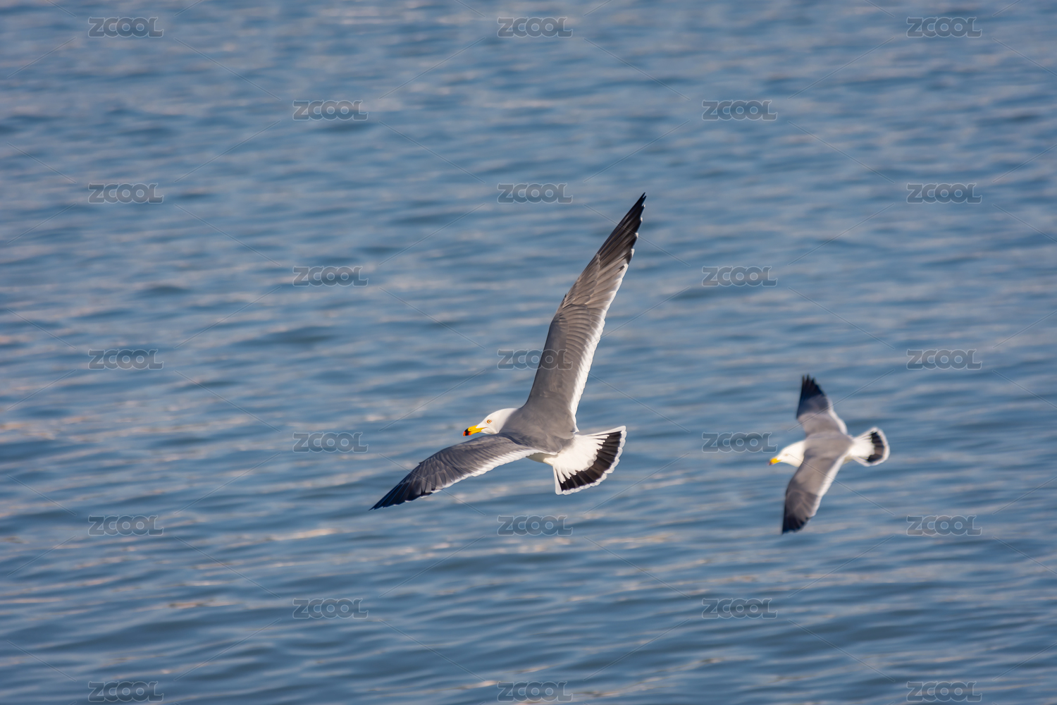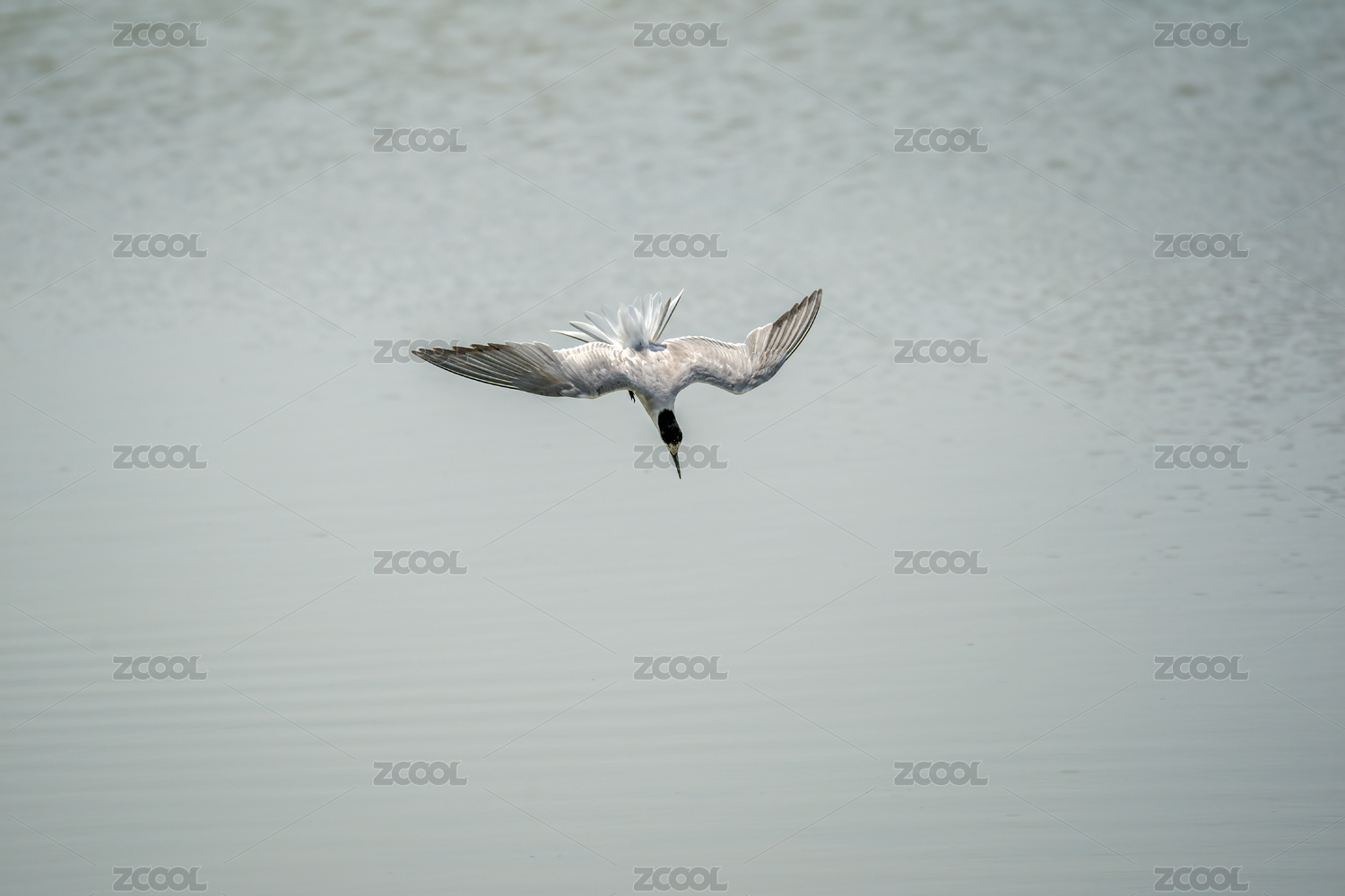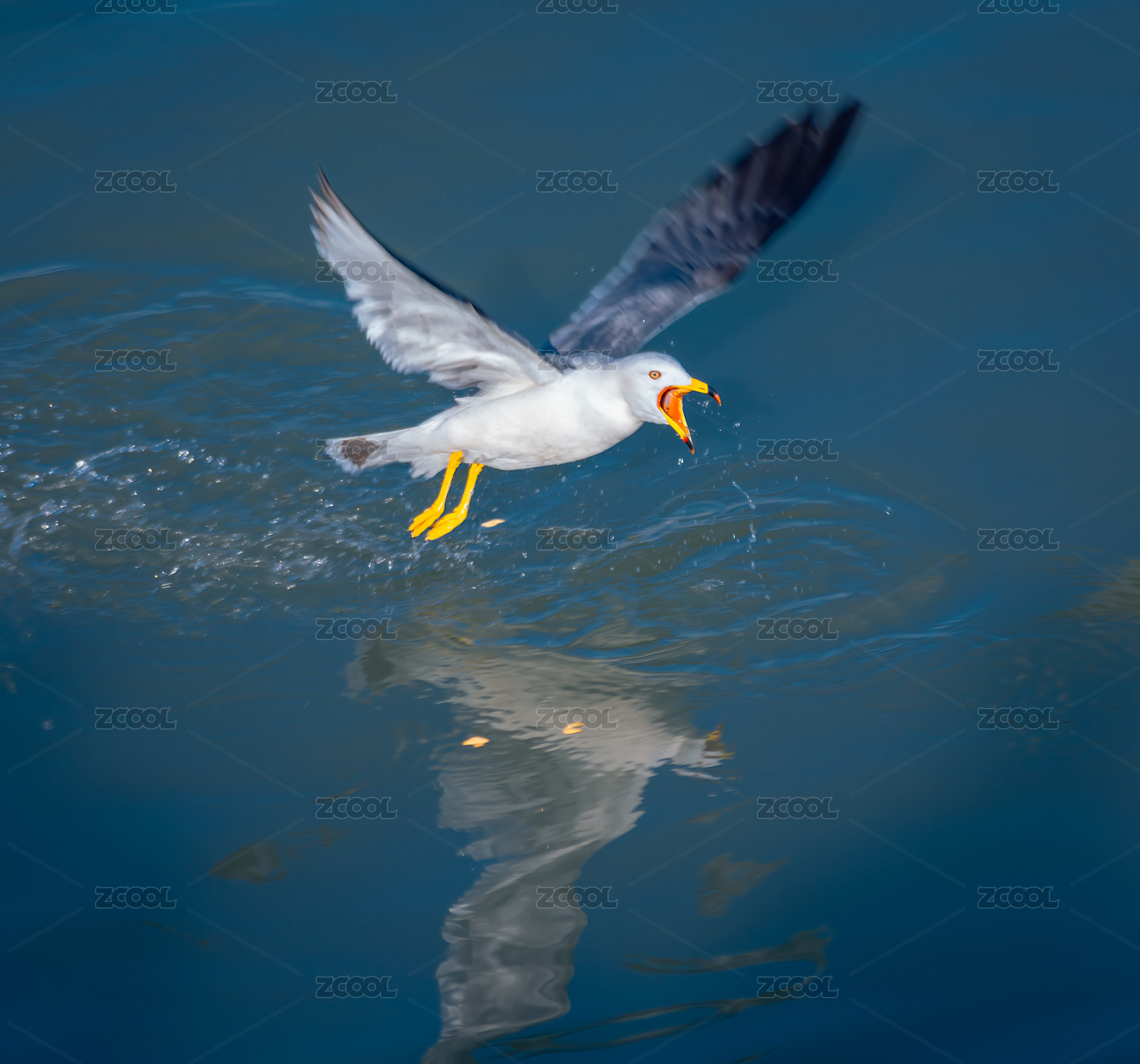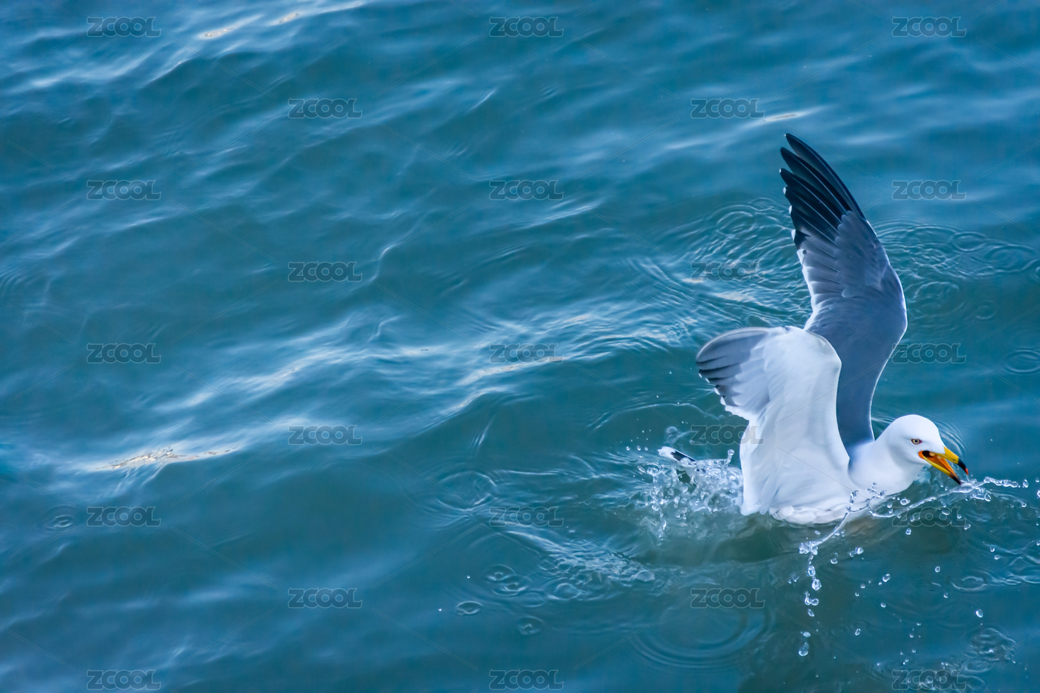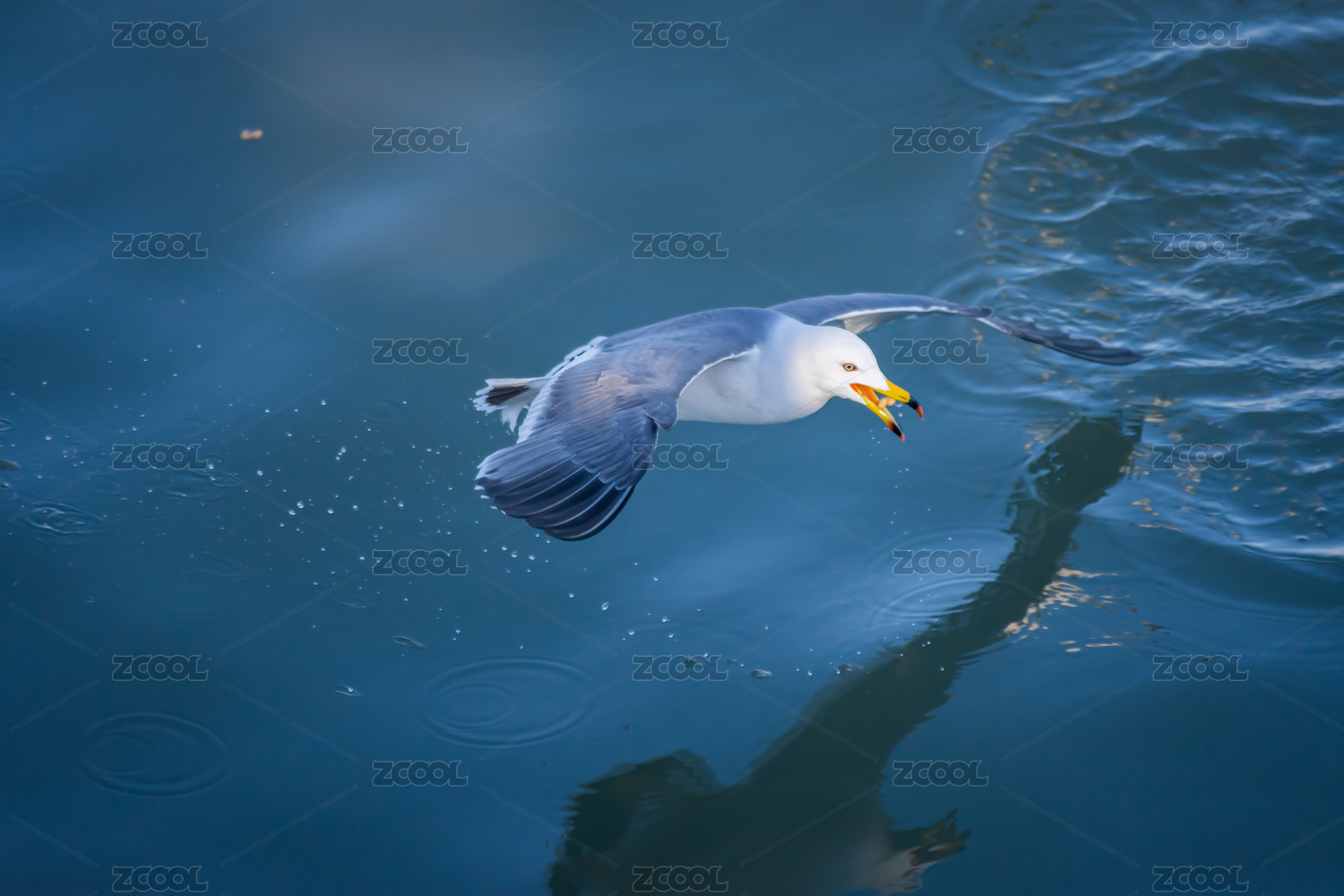 海鷗在海面上低空飛翔扎進(jìn)水里捕食餅干