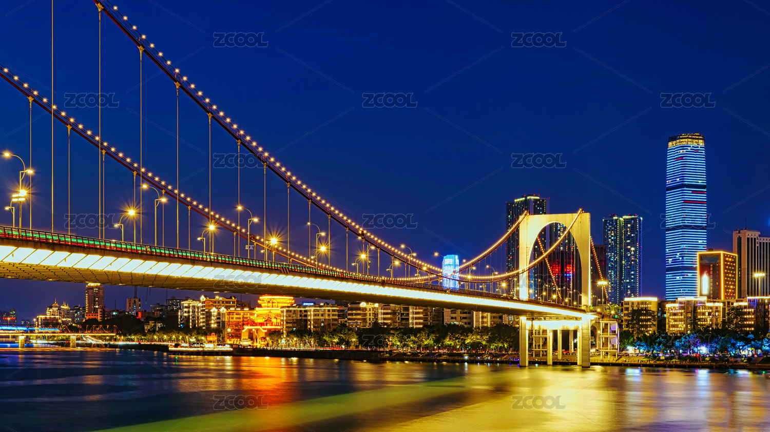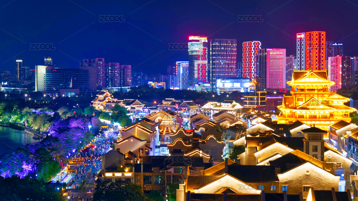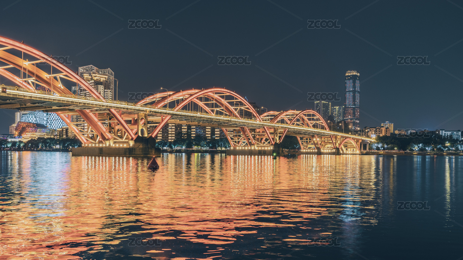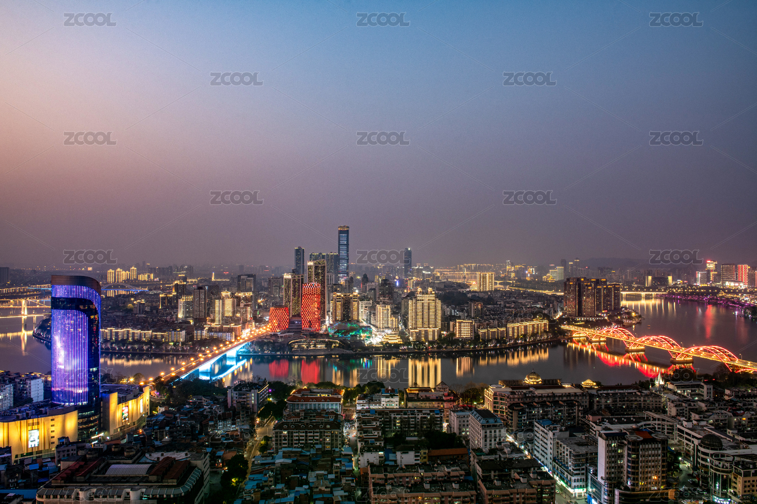 江邊摩天大樓與水面倒影,中國(guó)廣西柳州夜景