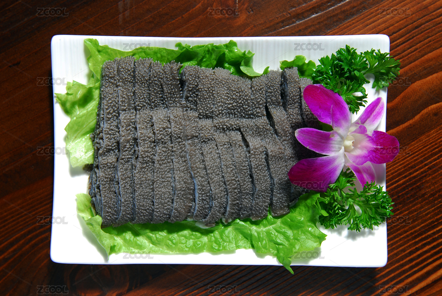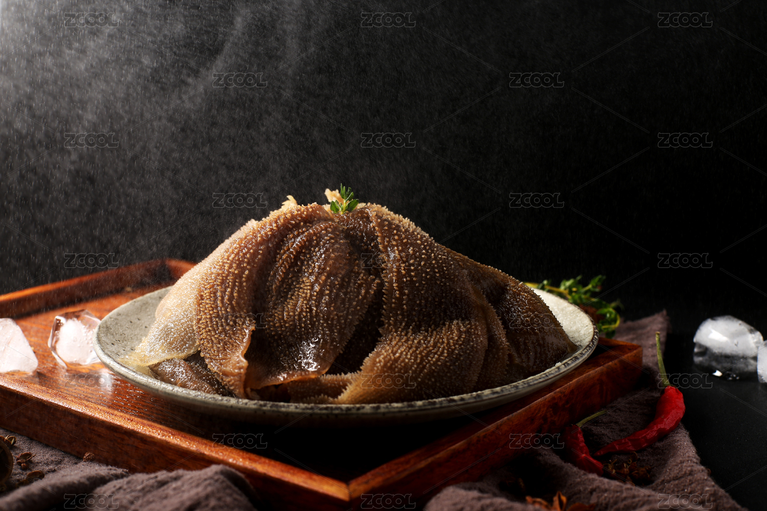 木紋桌上有一盤冰鮮毛肚火鍋涮菜蓋